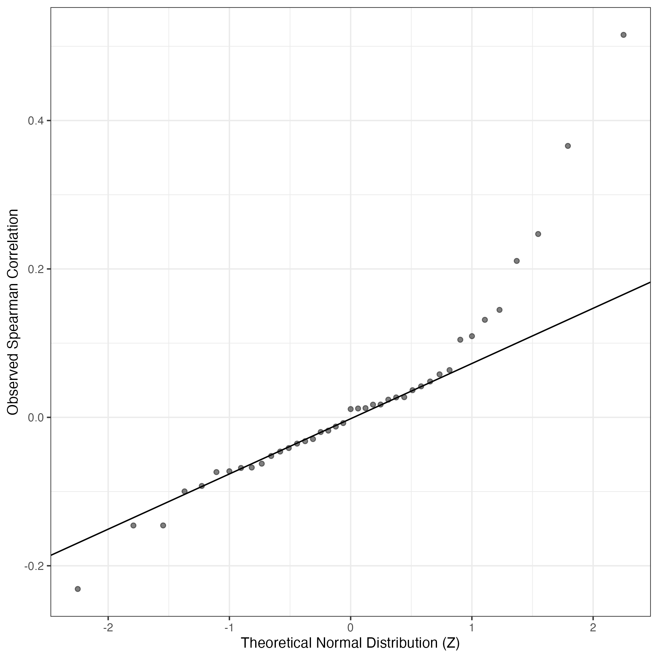 A similar QQ-plot as above, but only for instances where the H value is e.g. > 25, i.e. we are confident that the expression program is active above noise. Agreemenet between these binary vectors is tested using the Jaccard Index, with the P-values calculated by an exact test: