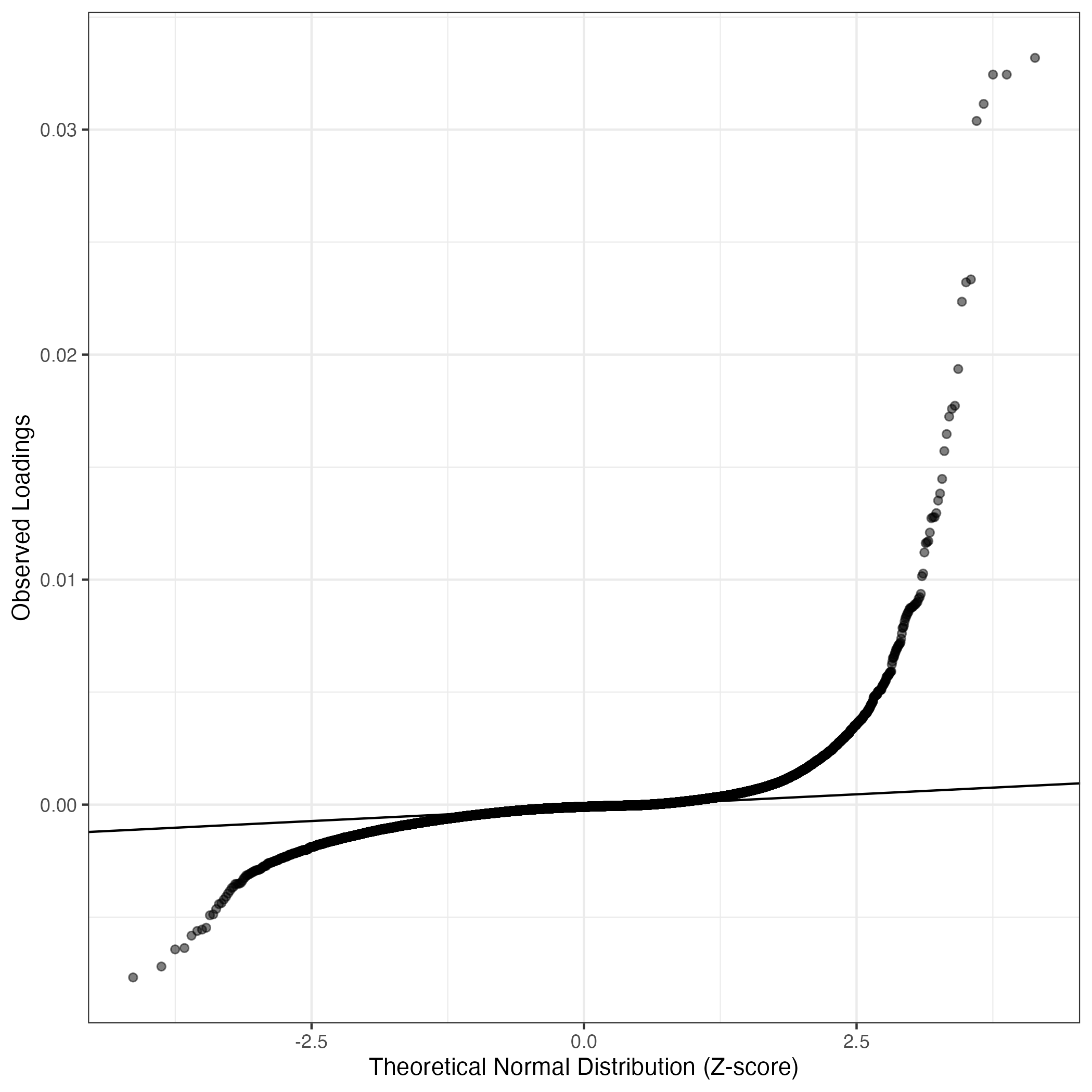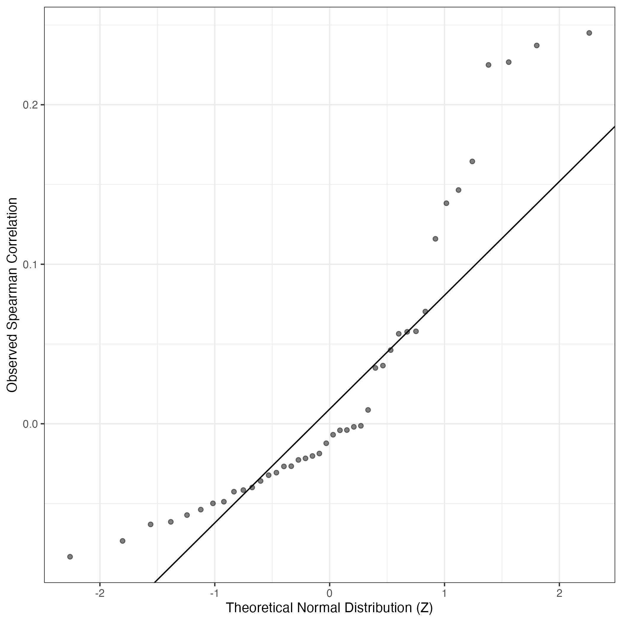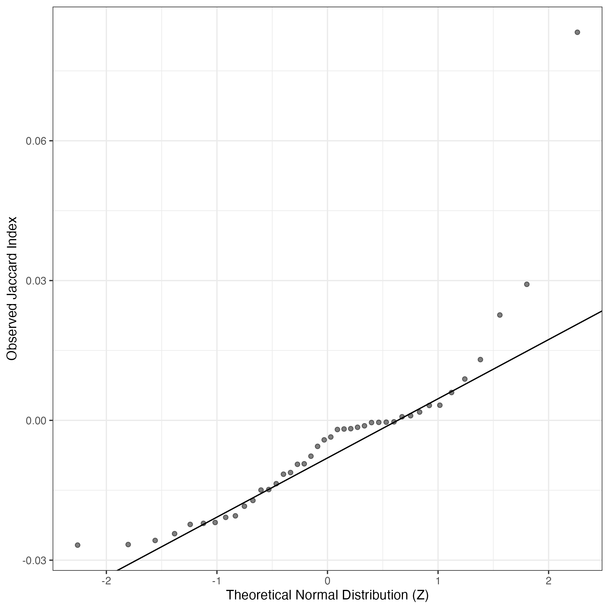 A similar QQ-plot as above, but only for instances where the H value is e.g. > 25, i.e. we are confident that the expression program is active above noise. Agreemenet between these binary vectors is tested using the Jaccard Index, with the P-values calculated by an exact test: