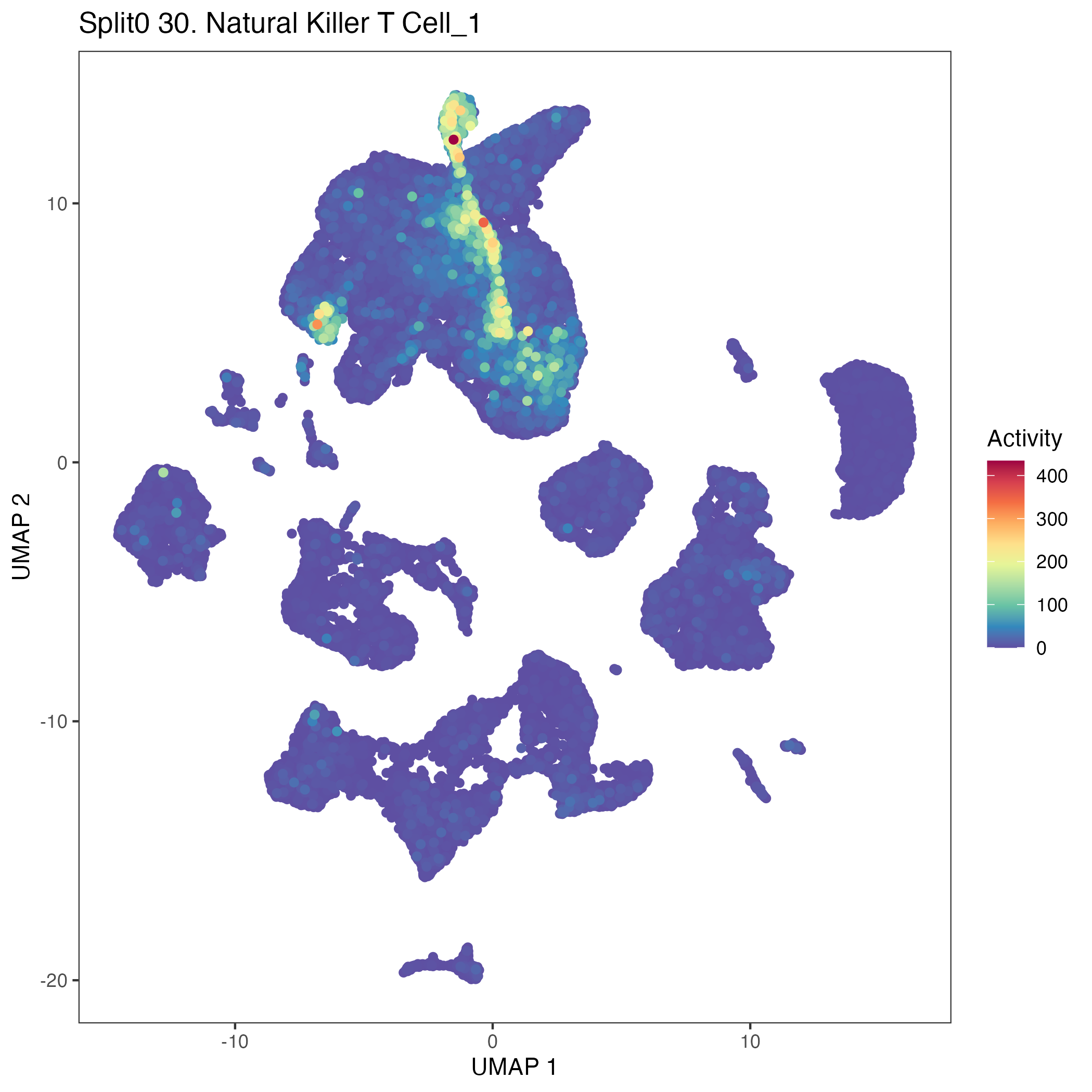 Cycling cells: Cycling T cells (curated markers) proliferating T lymphocytes: Wilcoxon ranksum test P-value for gene set overrepresentation: 9.89e-01 Mean rank of genes in gene set: 27588.5 Rank on gene expression program of genes in gene set: