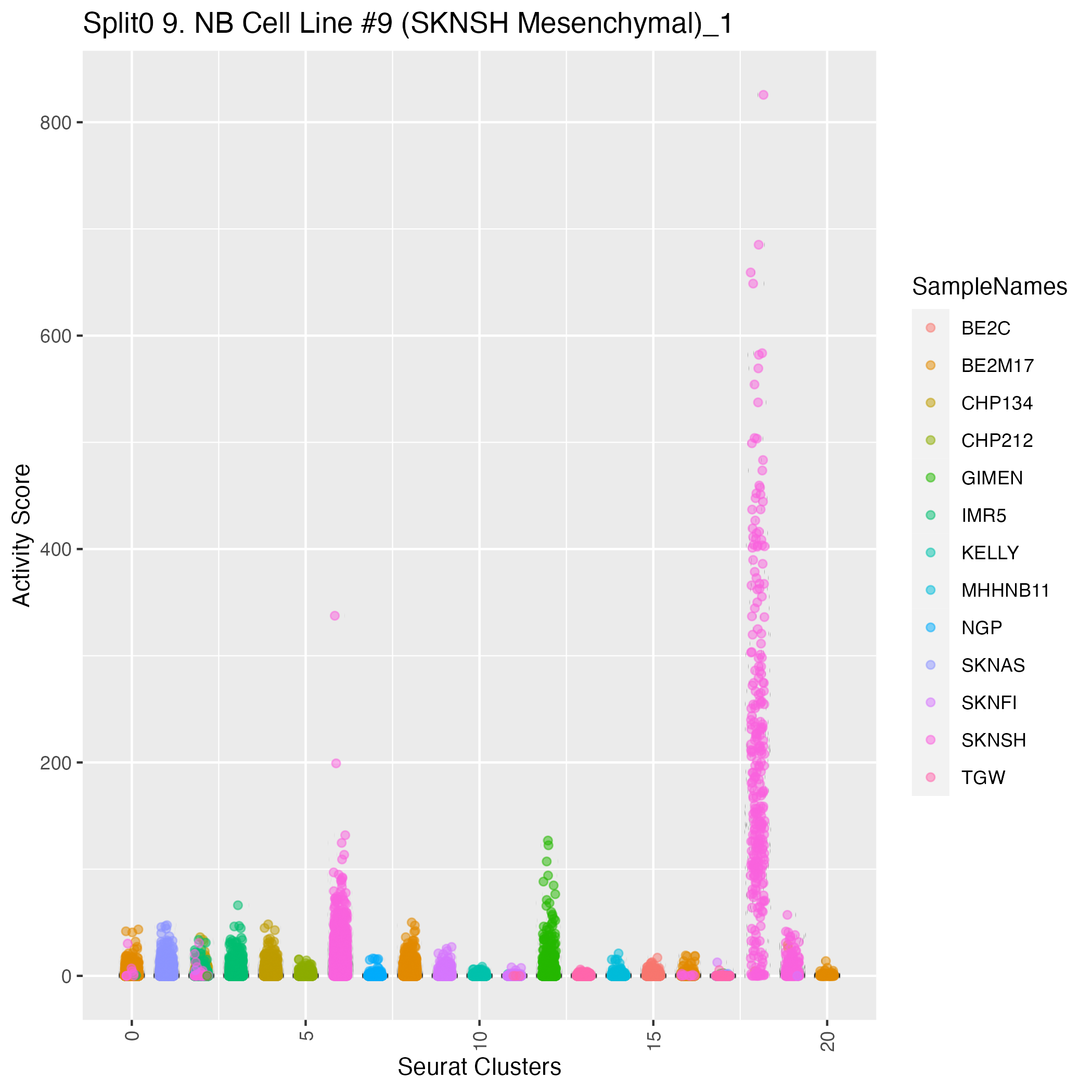 Mesemchymal validated (Olsen) Stated on pages 7 and 8 of the main text of Olsen et al. https://www.biorxiv.org/content/10.1101/2020.05.04.077057v1 - it is stated that a mesenchymal-like neuroblastoma cell state is validate by combined immunofluorescence staining for PDGFRA and FISH for PPMID gain, a gene on 17q.: Wilcoxon ranksum test P-value for gene set overrepresentation: 6.66e-01 Mean rank of genes in gene set: 7827 Rank on gene expression program of genes in gene set: