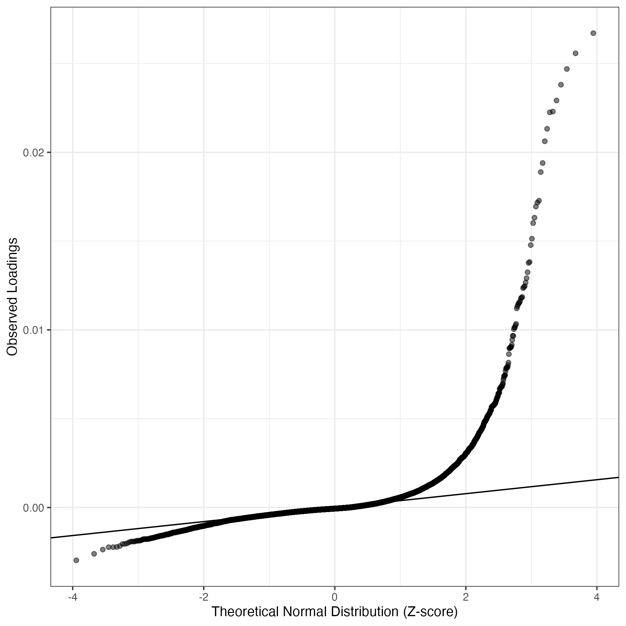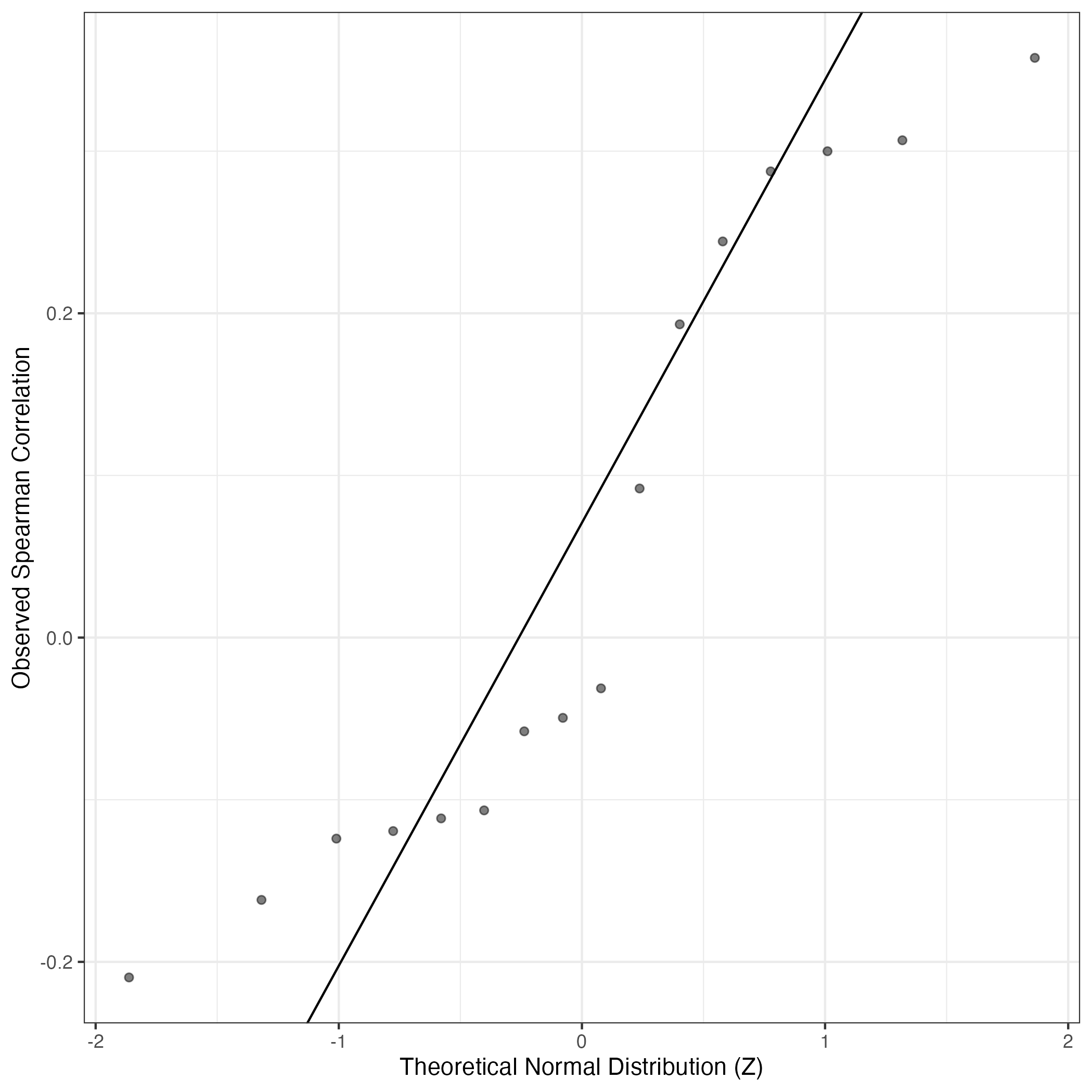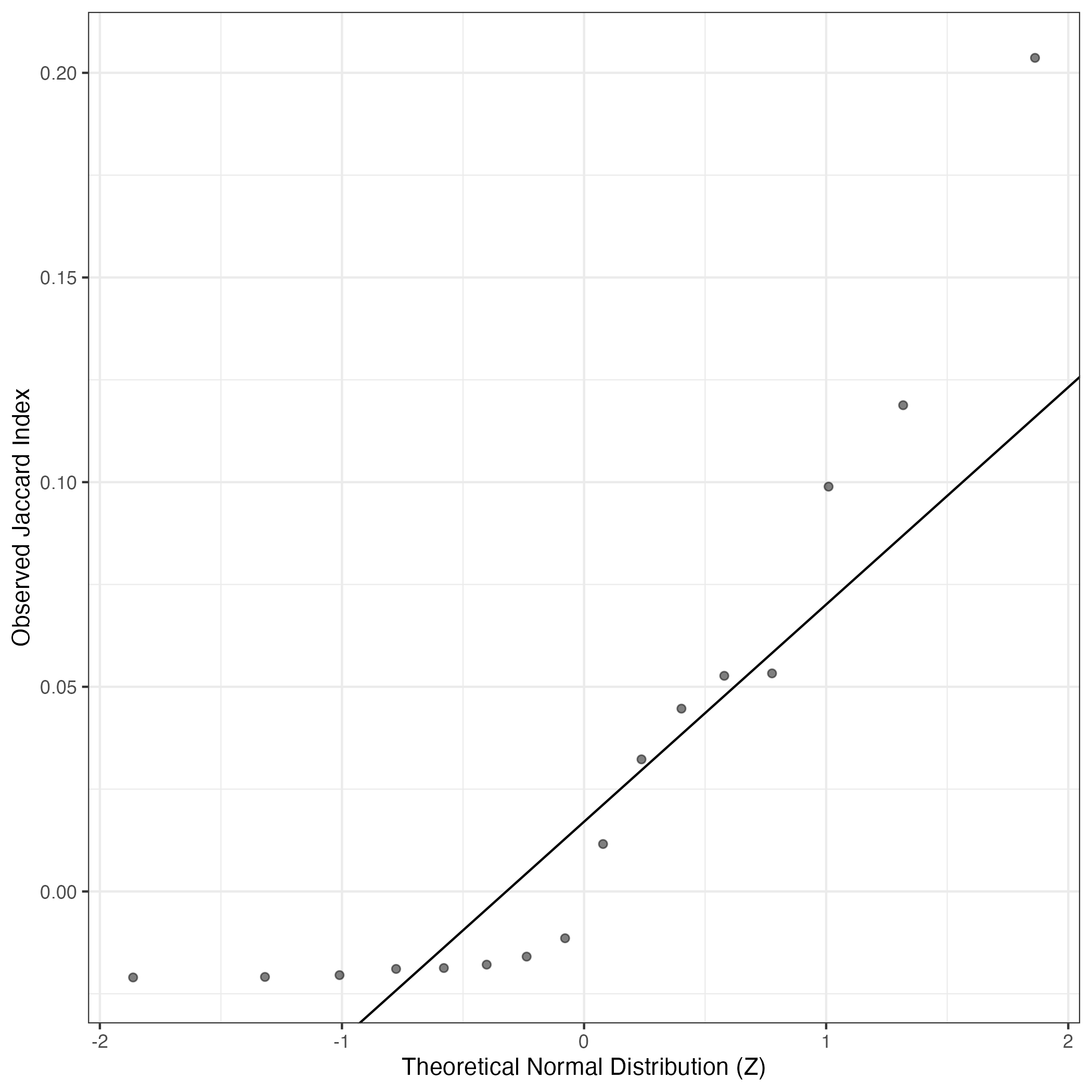 A similar QQ-plot as above, but only for instances where the H value is e.g. > 25, i.e. we are confident that the expression program is active above noise. Agreemenet between these binary vectors is tested using the Jaccard Index, with the P-values calculated by an exact test: