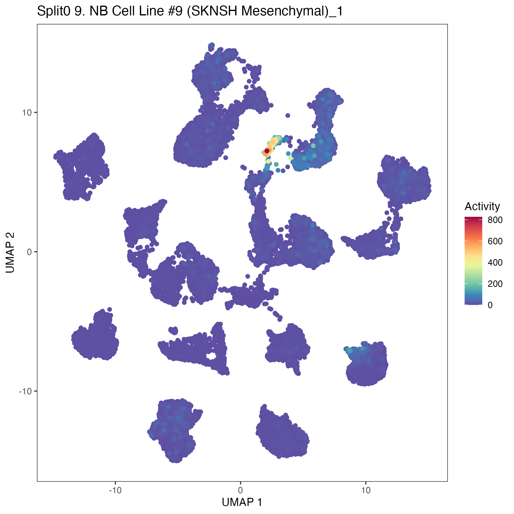 SCPs neuroblastoma unique (Olsen) Similar to above, but for genes unique to neuroblastoma SCP-like cells. Note FN1 is often used as a mesenchymal marker gene.: Wilcoxon ranksum test P-value for gene set overrepresentation: 2.60e-01 Mean rank of genes in gene set: 5321.83 Rank on gene expression program of genes in gene set: