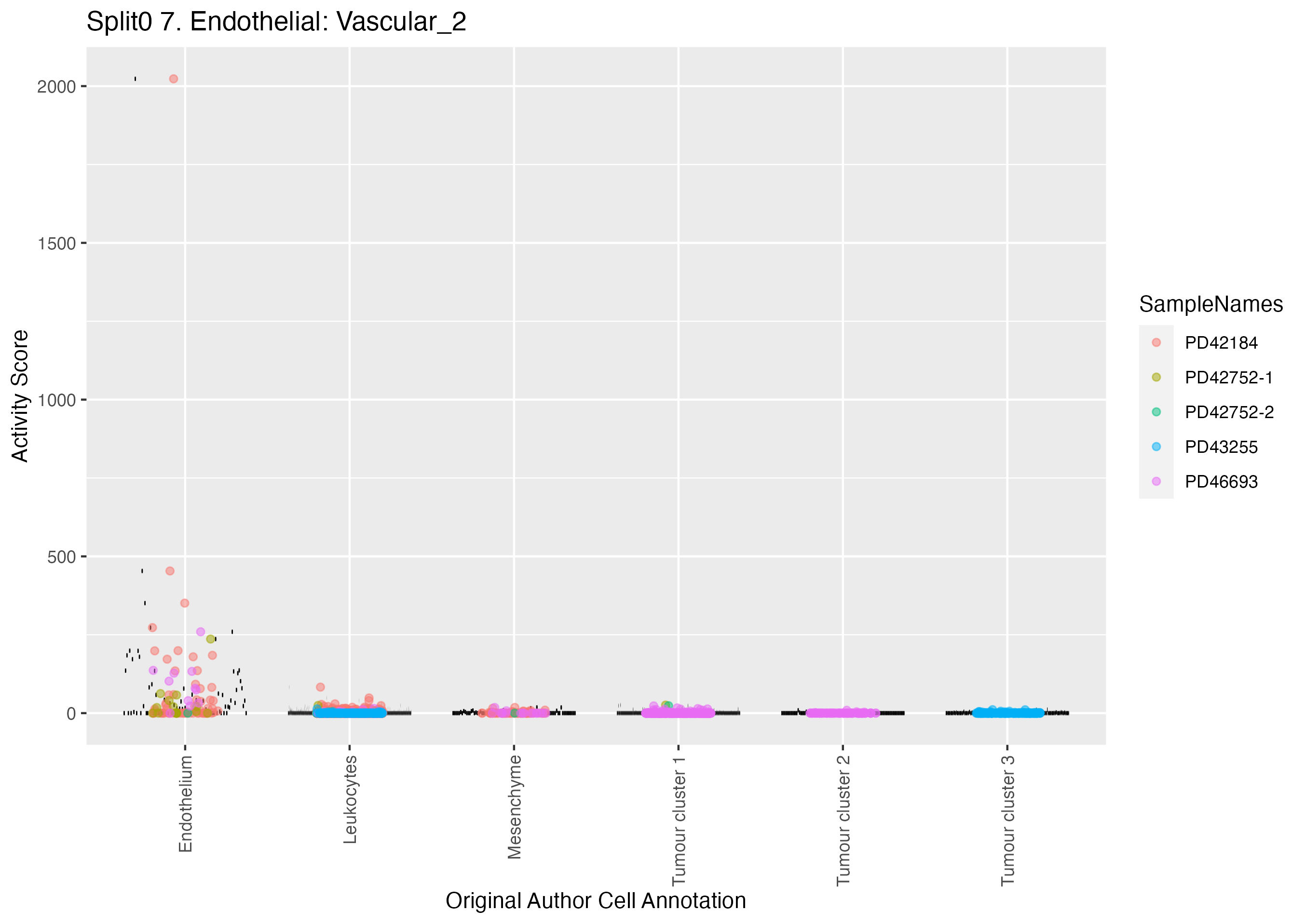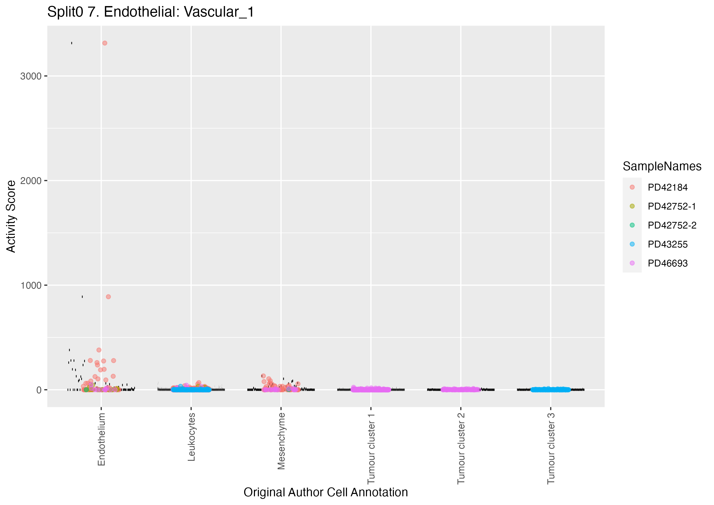 Vascular (Kildisiute) Vascular markers obtained from Kildisiute et al, Supplmenentary Table 2, references supporting these genes are provided in Supp Table S2 of Kildisiute et al (PMID 33547074) https://www.science.org/doi/suppl/10.1126/sciadv.abd3311/suppl_file/abd3311_tables_s1_to_s12.xlsx: Wilcoxon ranksum test P-value for gene set overrepresentation: 1.62e-01 Mean rank of genes in gene set: 4216 Rank on gene expression program of genes in gene set: