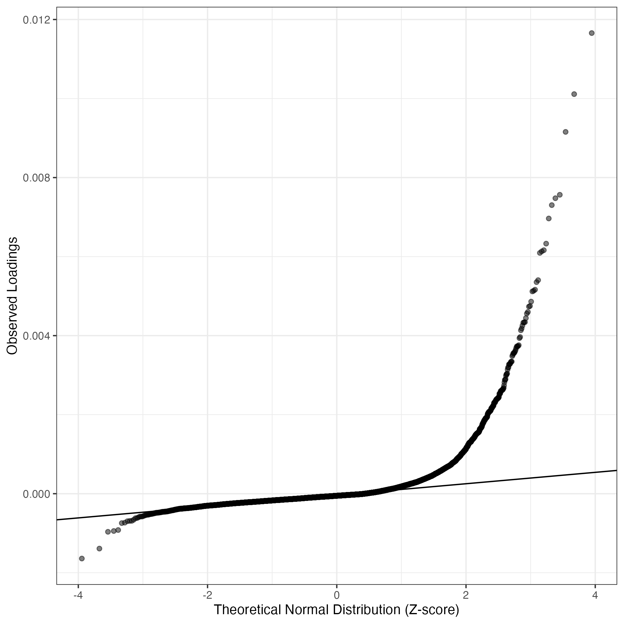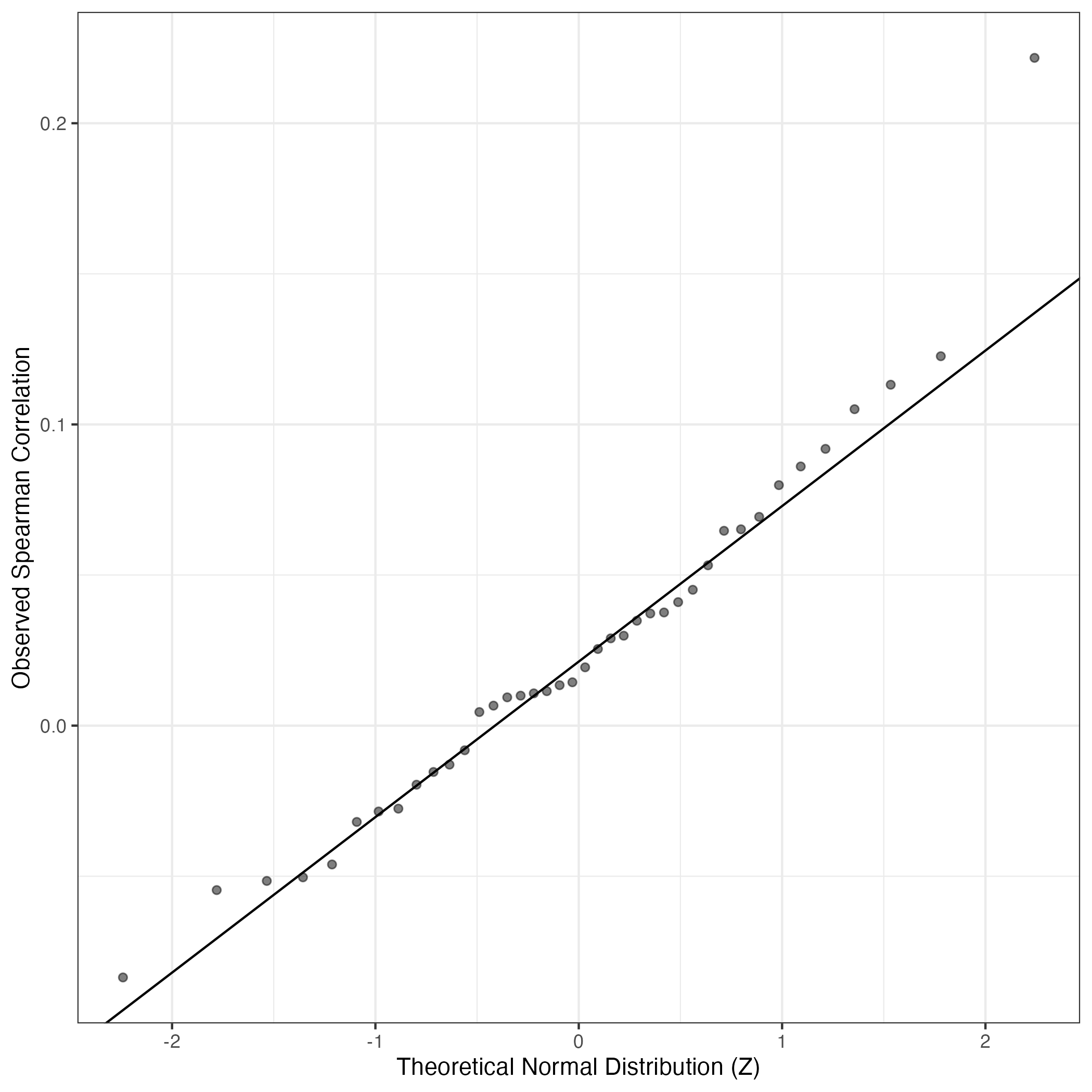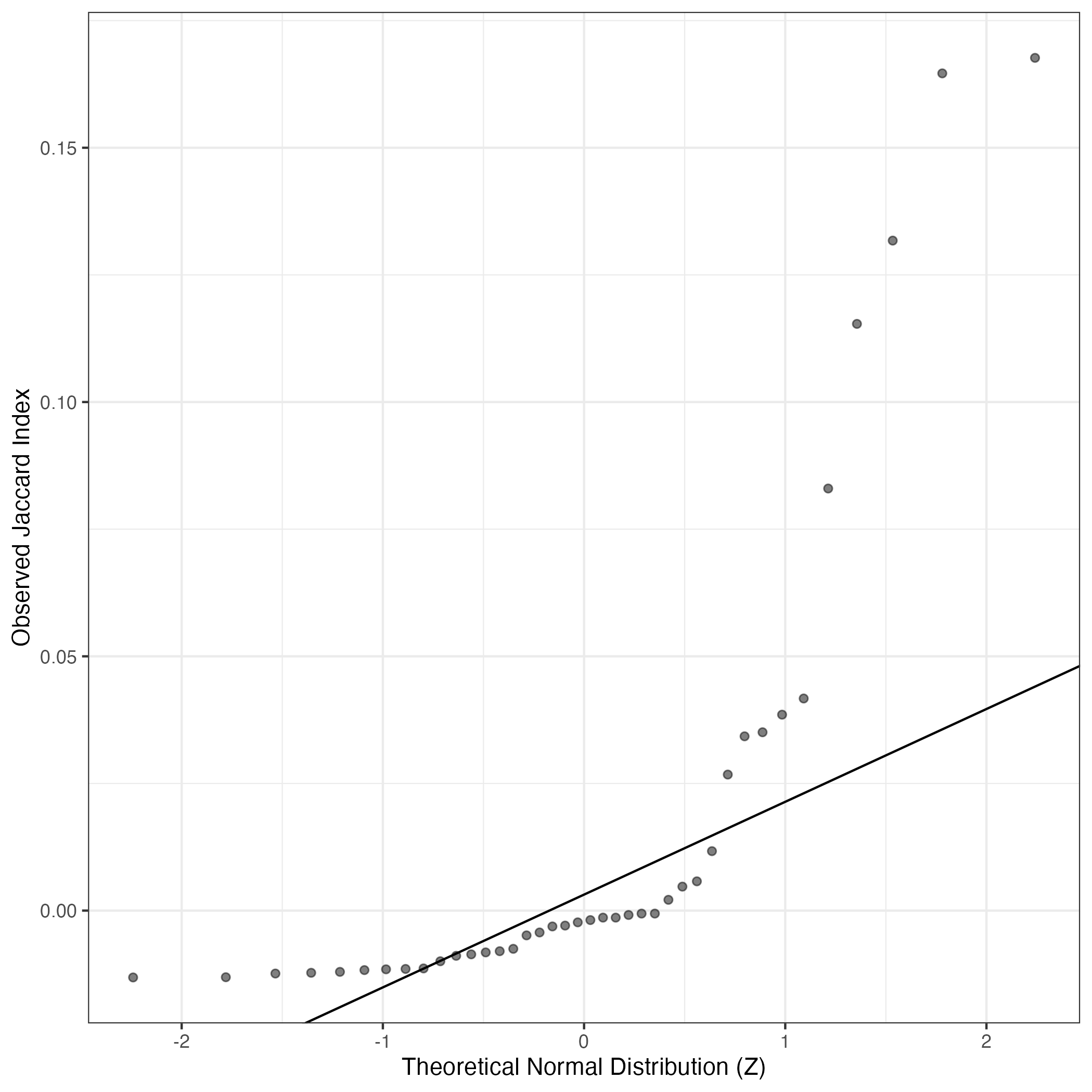 A similar QQ-plot as above, but only for instances where the H value is e.g. > 25, i.e. we are confident that the expression program is active above noise. Agreemenet between these binary vectors is tested using the Jaccard Index, with the P-values calculated by an exact test: