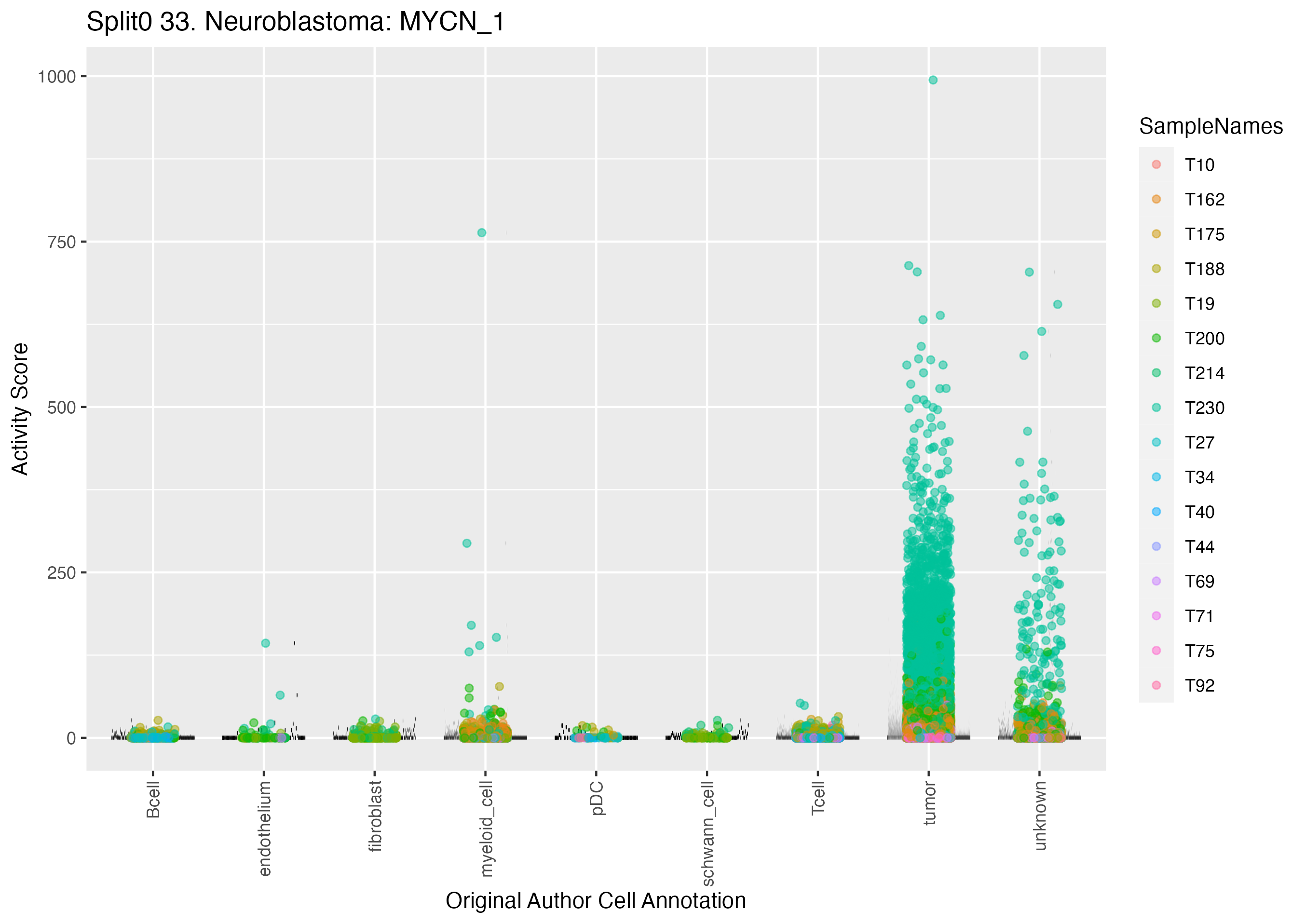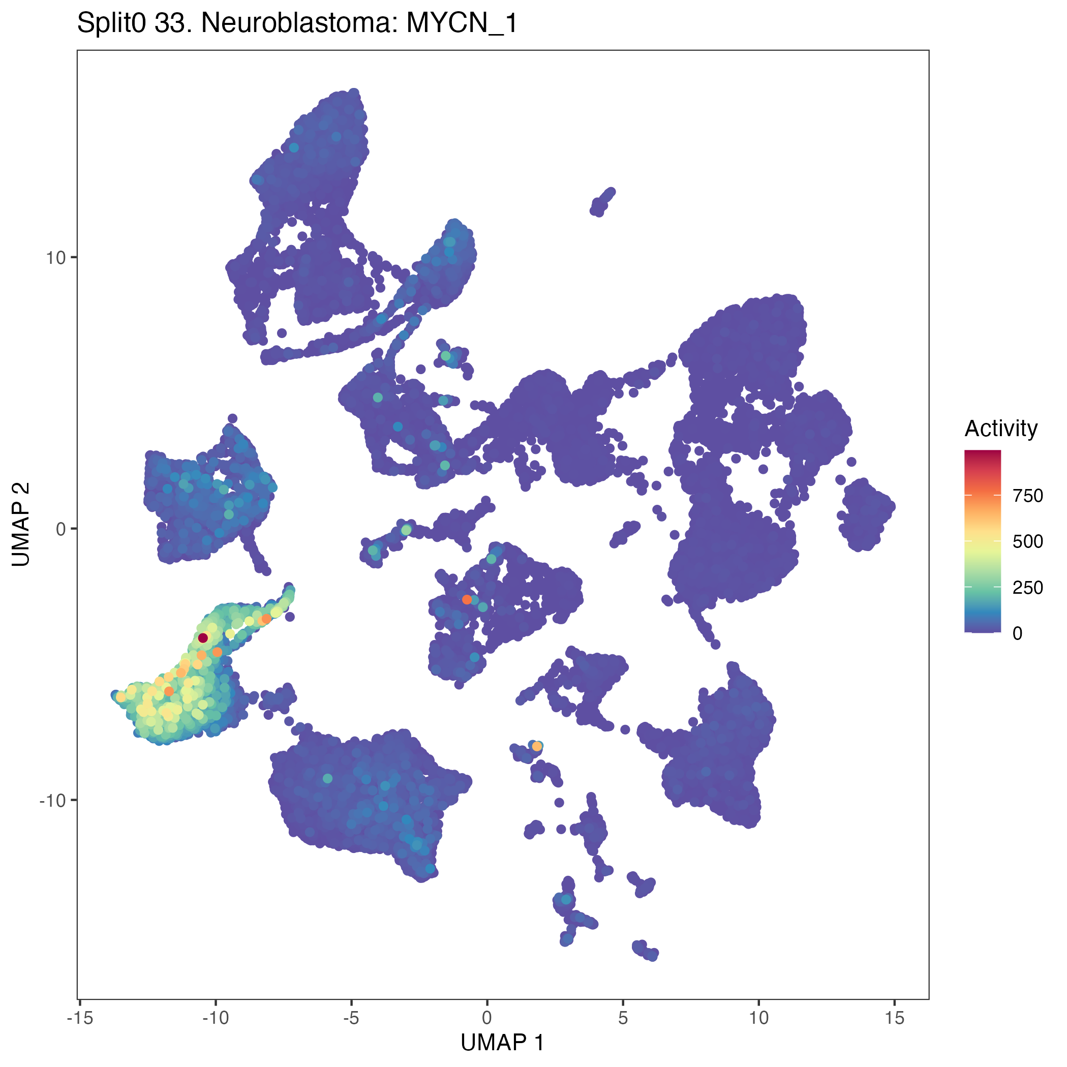UMAP plots showing activity of gene expression program identified in GEP 33. Neuroblastoma: MYCN: