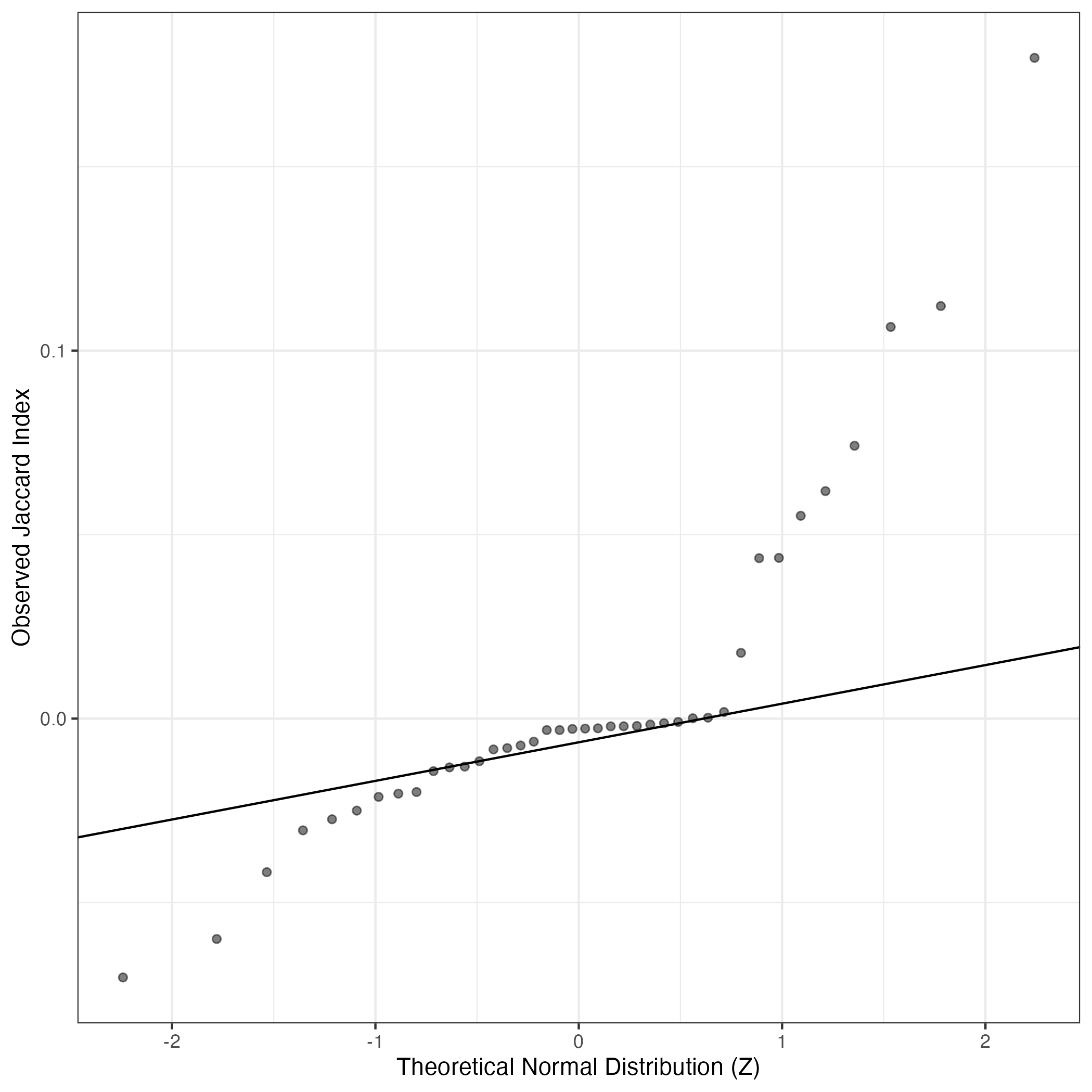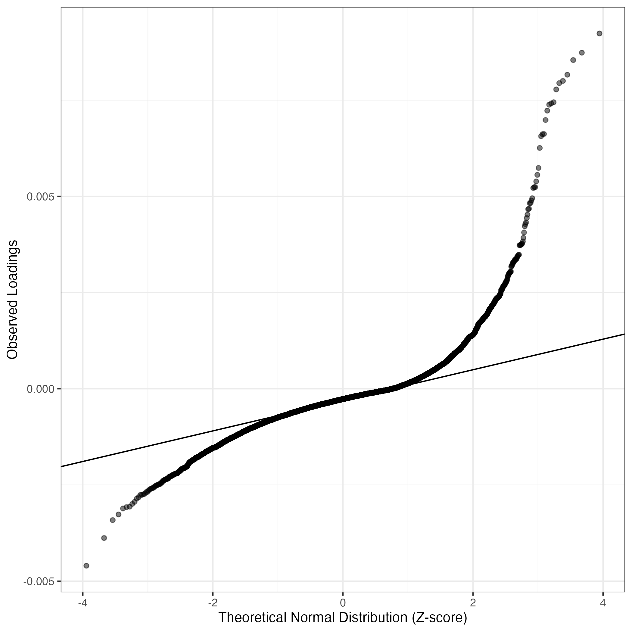 QQ-plot of gene loadings, averaged over both independent splits of the data