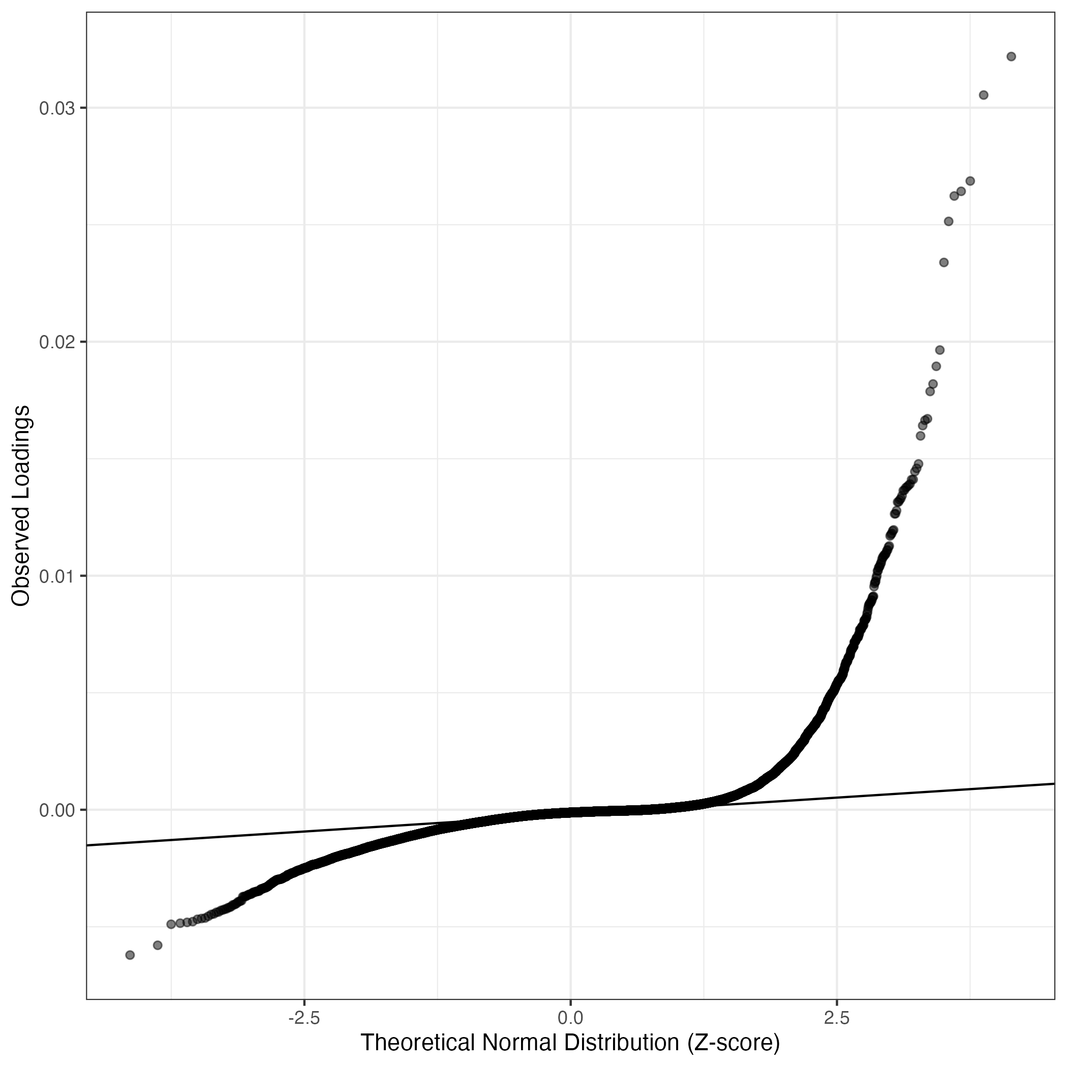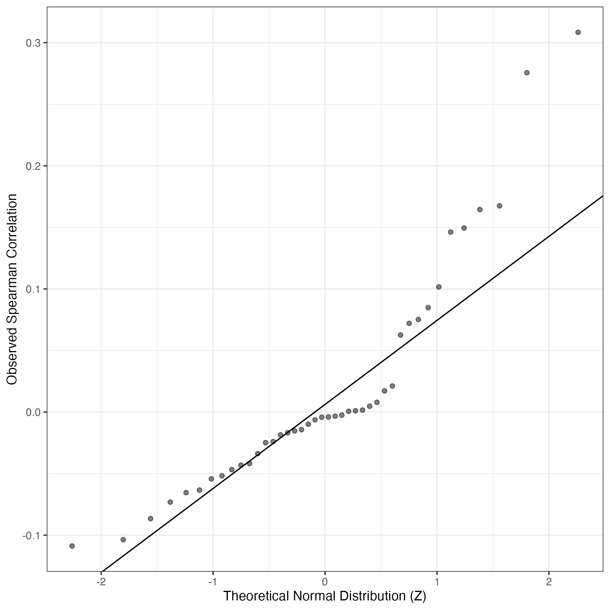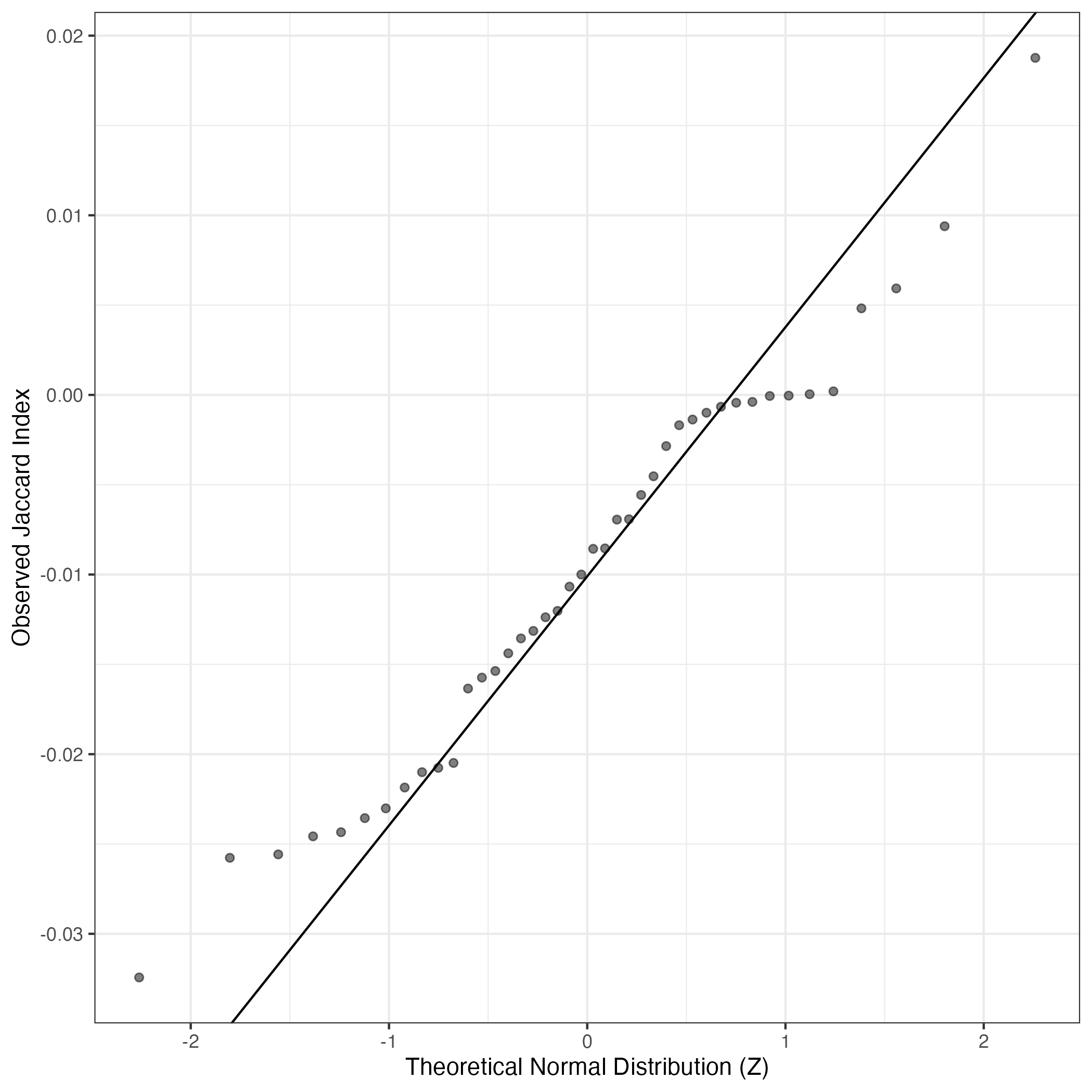 A similar QQ-plot as above, but only for instances where the H value is e.g. > 25, i.e. we are confident that the expression program is active above noise. Agreemenet between these binary vectors is tested using the Jaccard Index, with the P-values calculated by an exact test: