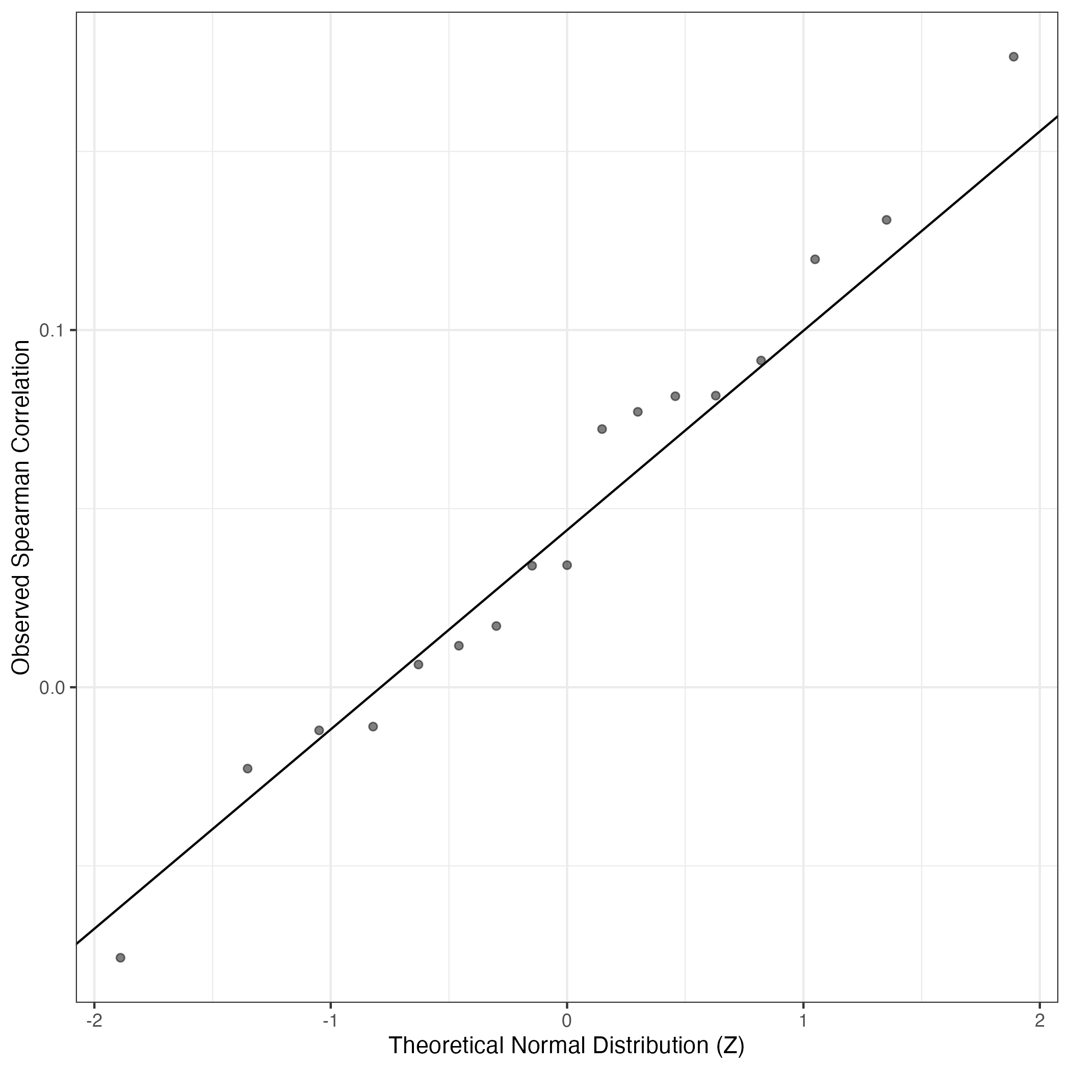 QQ-plot of gene loadings, averaged over both independent splits of the data