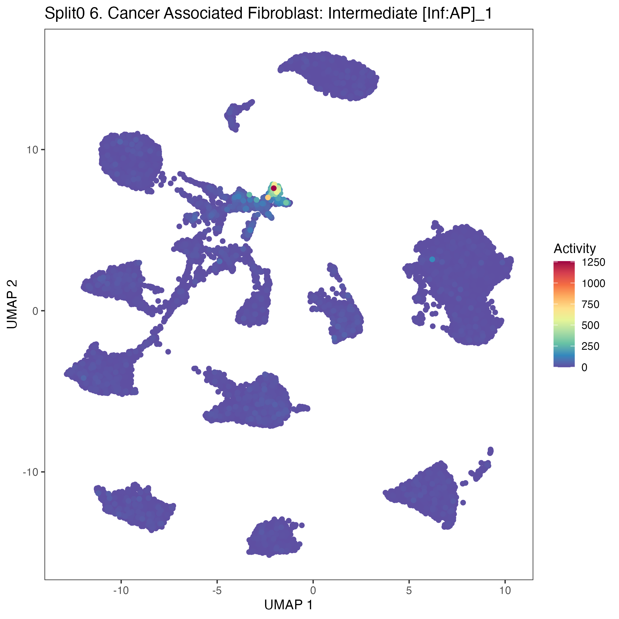 UMAP plots showing activity of gene expression program identified in community:6. Cancer Associated Fibroblast: Intermediate [Inf:AP]