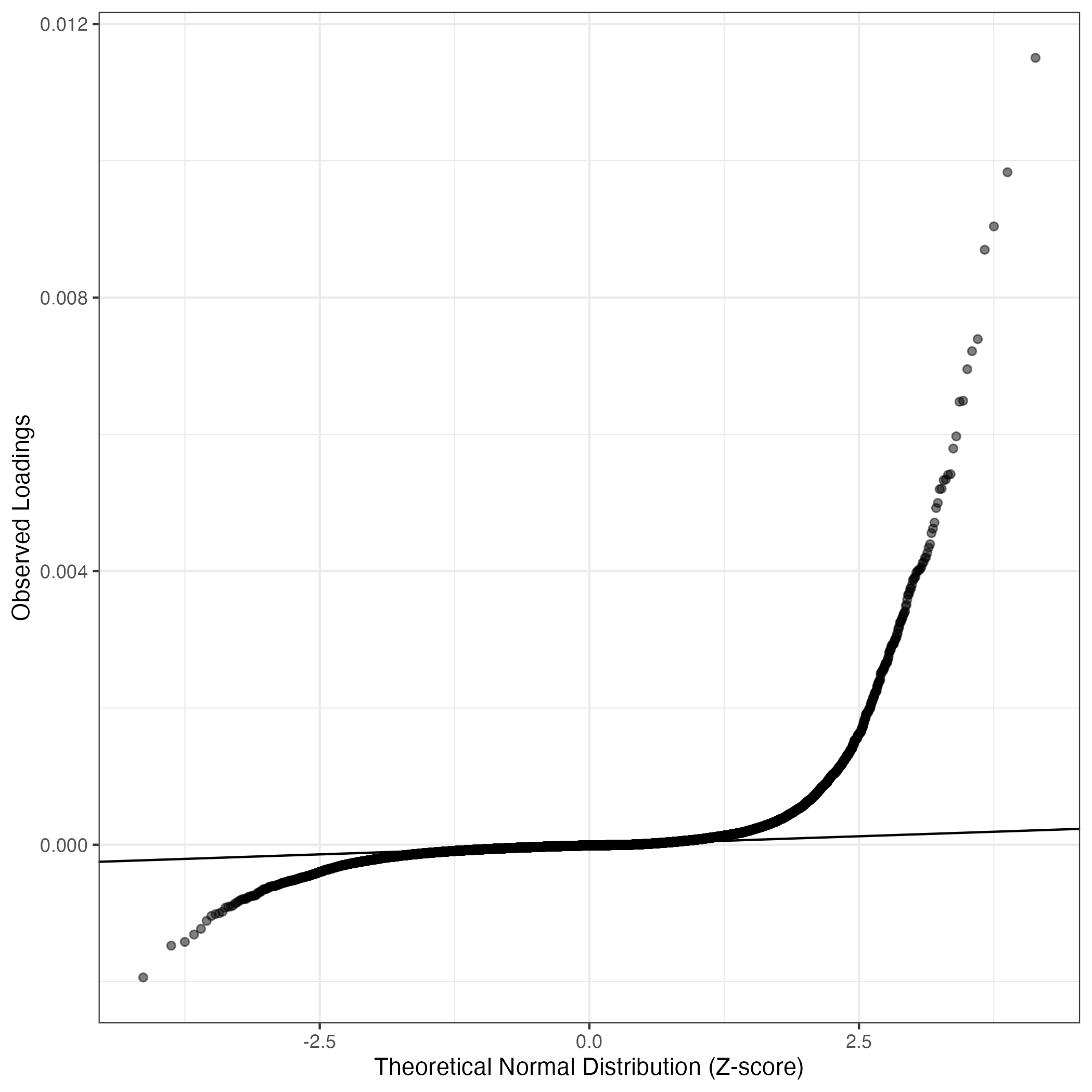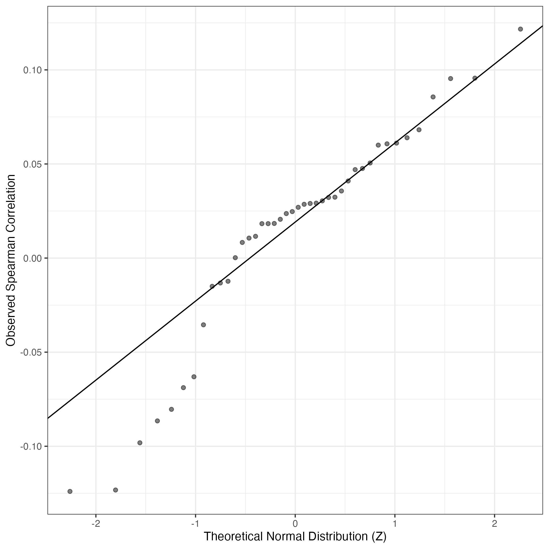 A similar QQ-plot as above, but only for instances where the H value is e.g. > 25, i.e. we are confident that the expression program is active above noise. Agreemenet between these binary vectors is tested using the Jaccard Index, with the P-values calculated by an exact test: