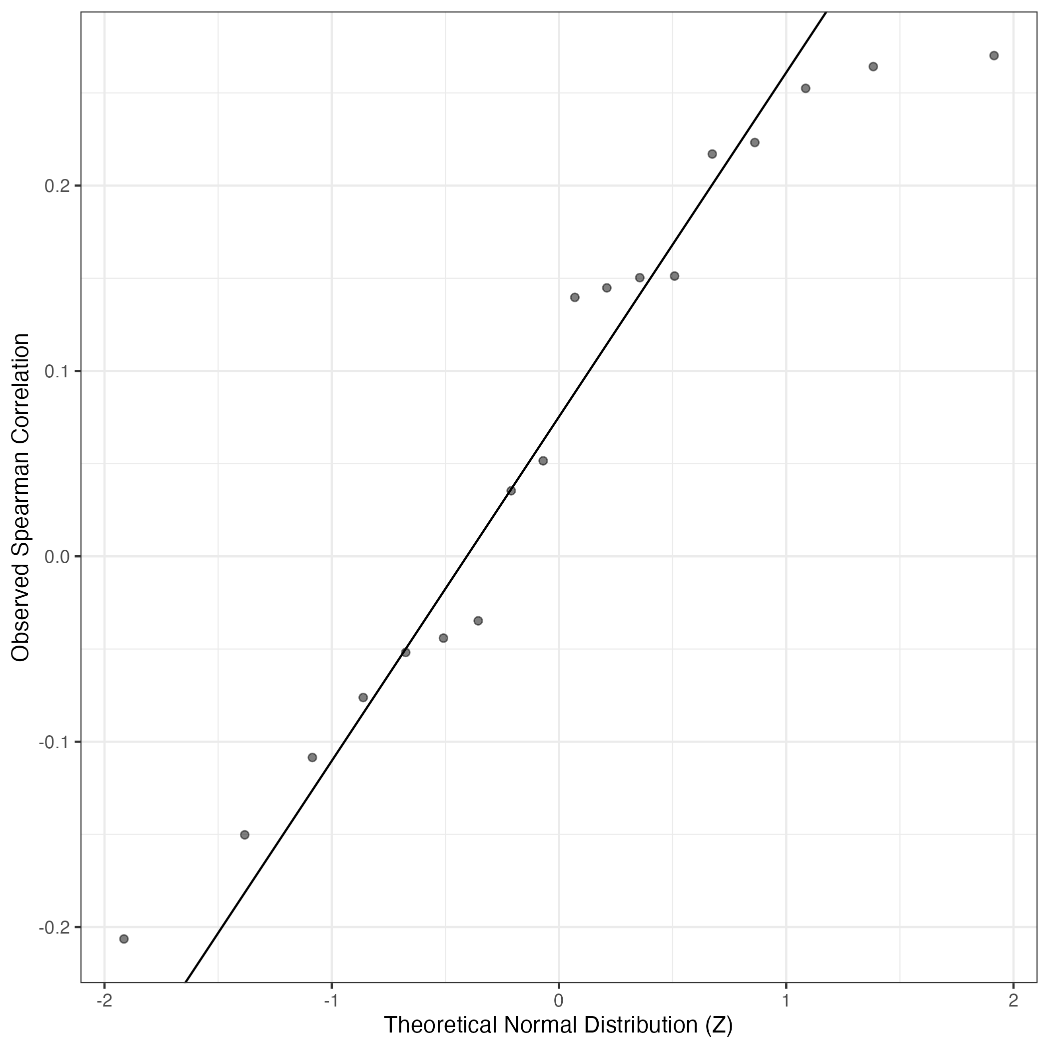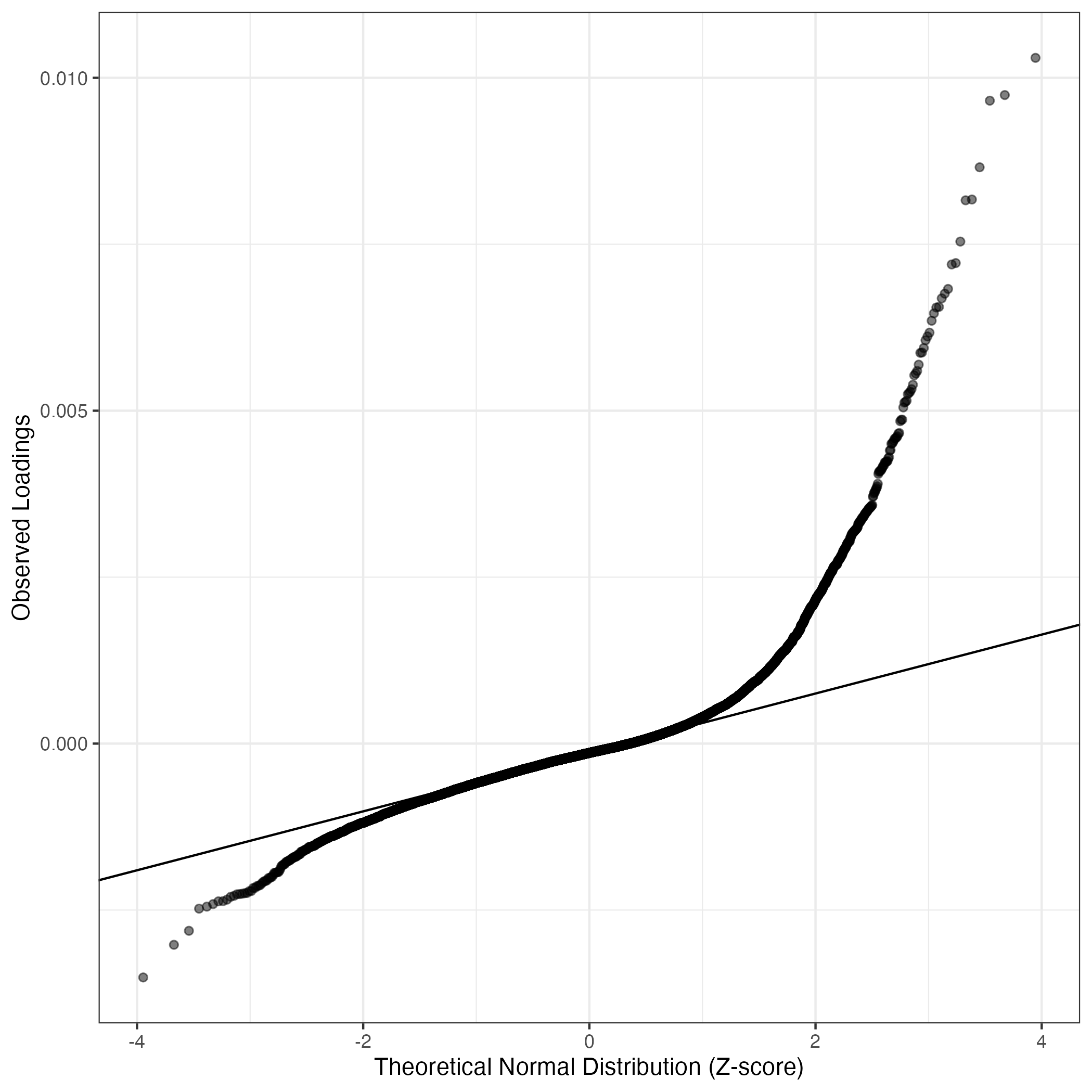 QQ-plot of gene loadings, averaged over both independent splits of the data