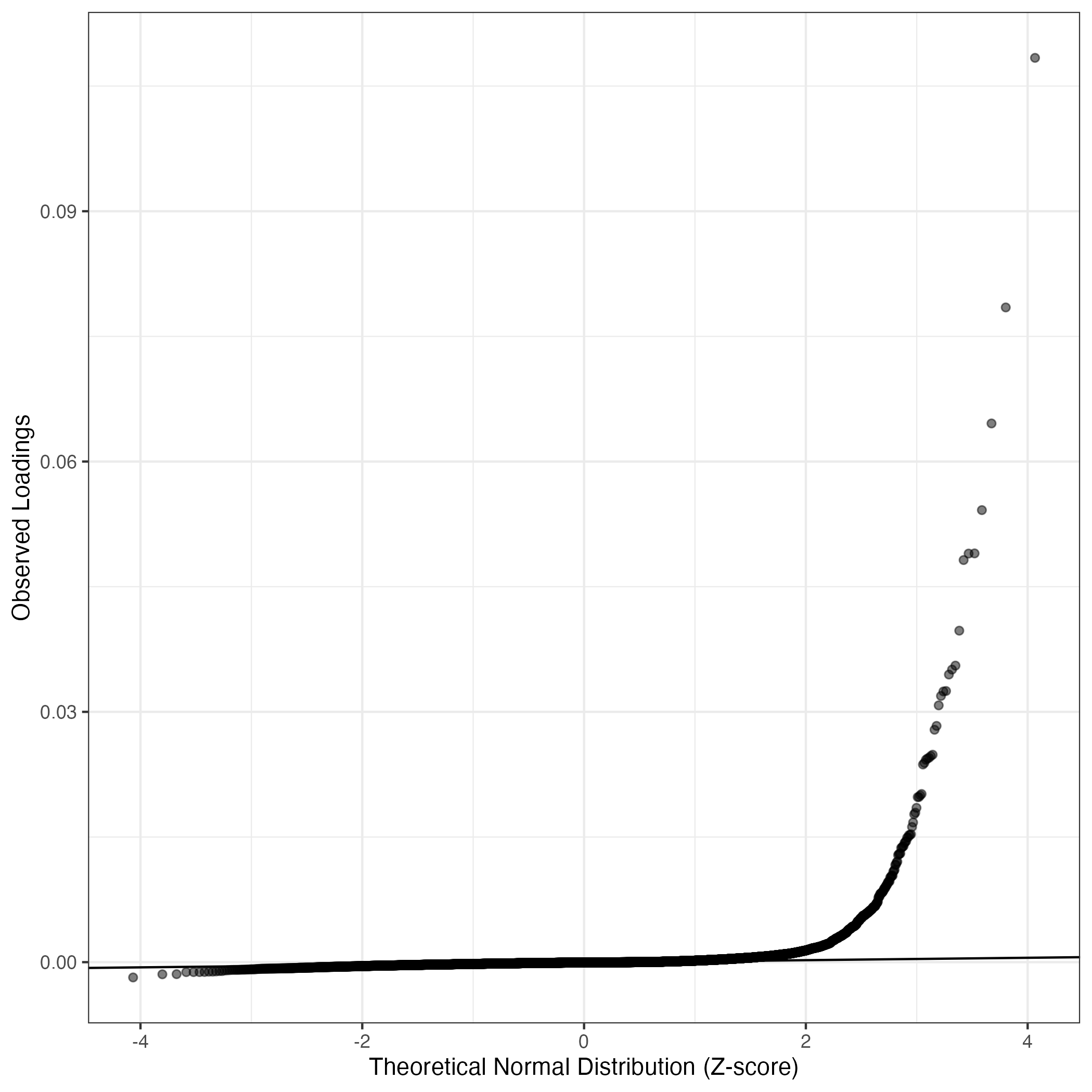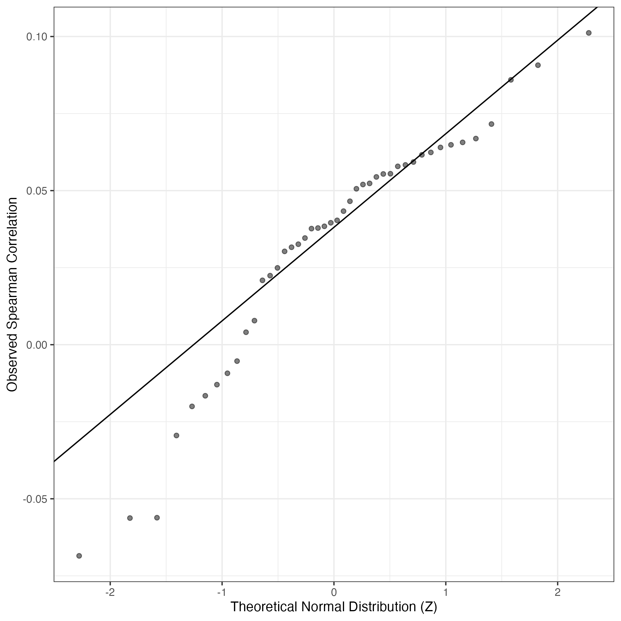 A similar QQ-plot as above, but only for instances where the H value is e.g. > 25, i.e. we are confident that the expression program is active above noise. Agreemenet between these binary vectors is tested using the Jaccard Index, with the P-values calculated by an exact test: