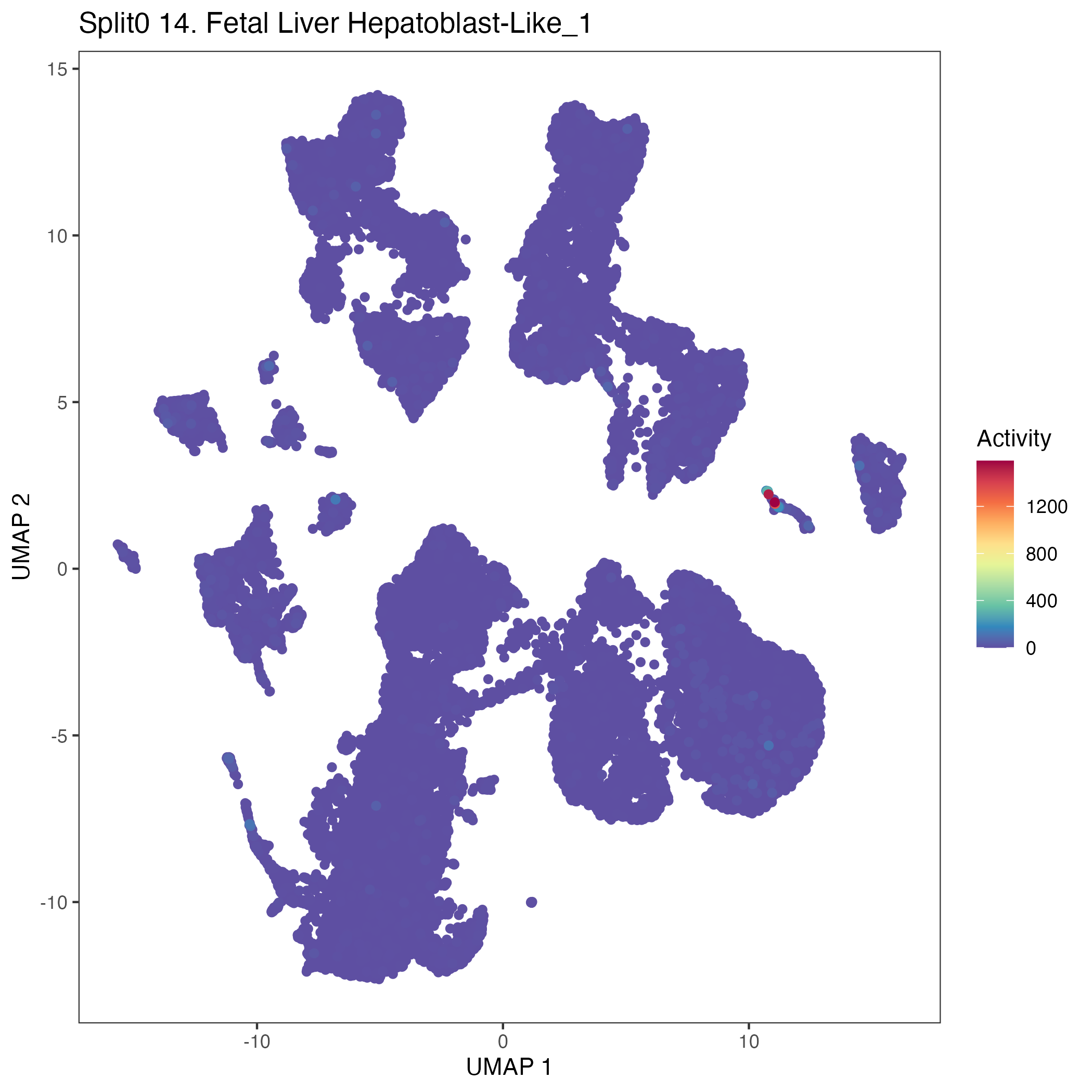 Hepatocytes (Jansky) Mentioned in the main text (Jansky et al, Nature Genetics (2021)), page 1, that ALB+ Hepatocytes were identified in their fetal adrenal glands, this is also highlighted in the UMAP plot on their Fig 1B. Additional genes also shown in their Extended data Figure 2D. The main text also speculated that these hepatocytes were probably derived from neighboring tissue, and hence artifactual, but there is no evidence presented for this.: Wilcoxon ranksum test P-value for gene set overrepresentation: 2.66e-01 Mean rank of genes in gene set: 8297.67 Rank on gene expression program of genes in gene set:
