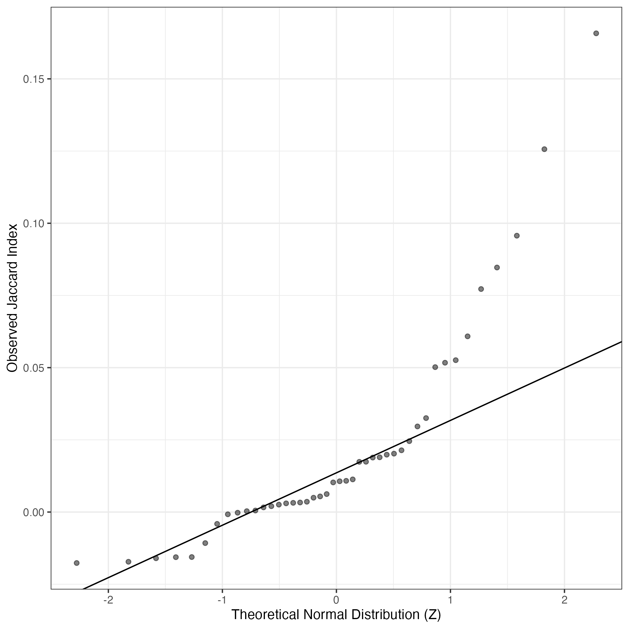 A similar QQ-plot as above, but only for instances where the H value is e.g. > 25, i.e. we are confident that the expression program is active above noise. Agreemenet between these binary vectors is tested using the Jaccard Index, with the P-values calculated by an exact test: