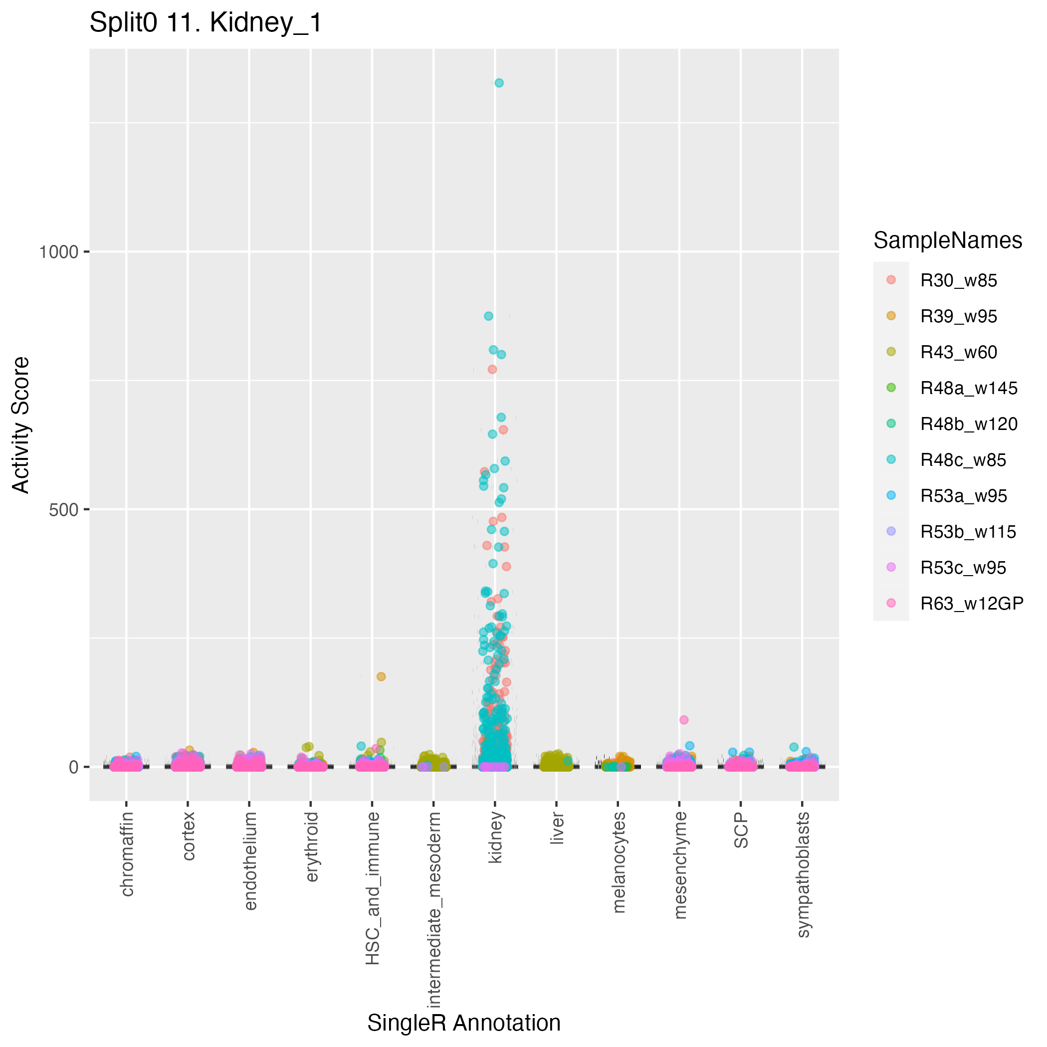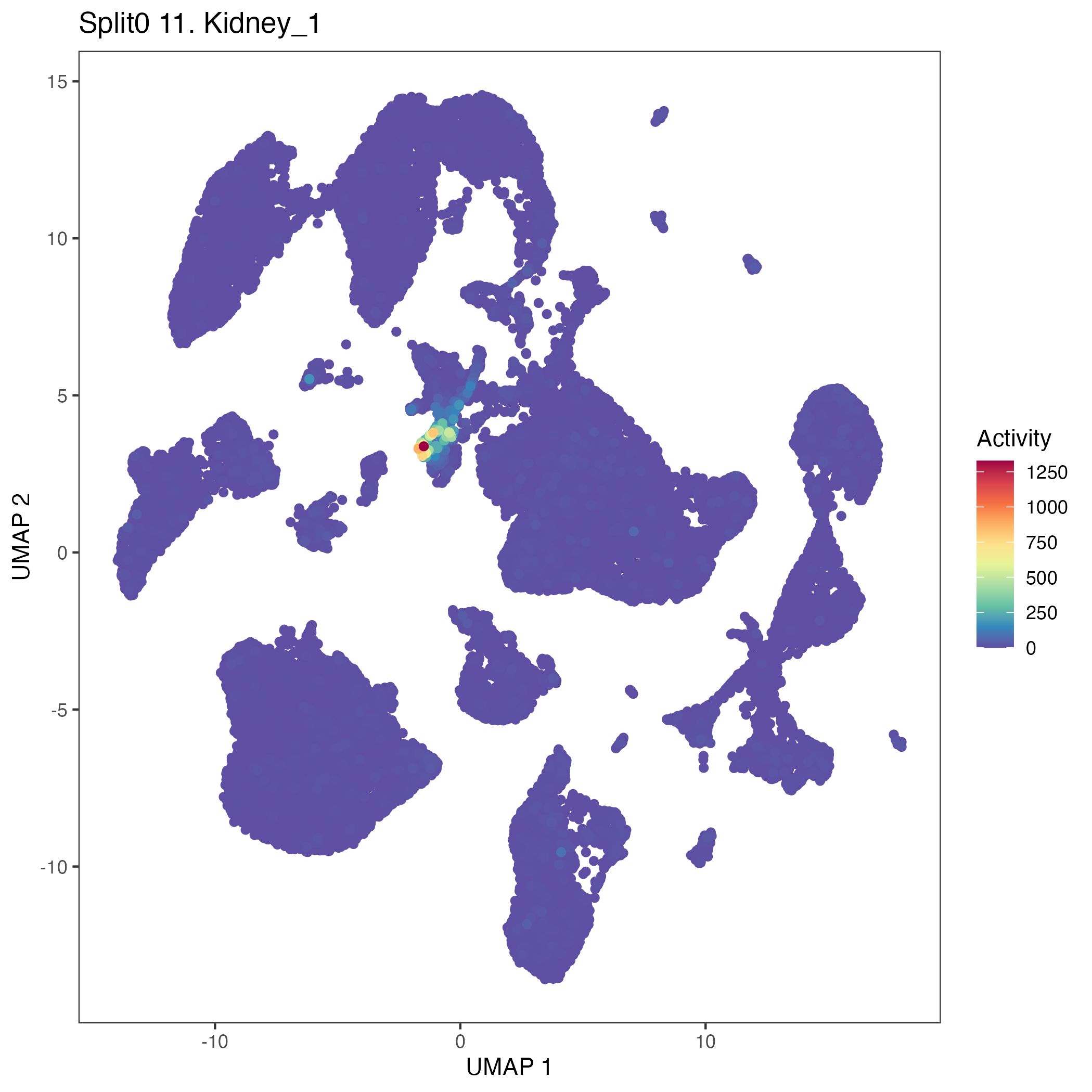 UMAP plots showing activity of gene expression program identified in GEP 11. Kidney: