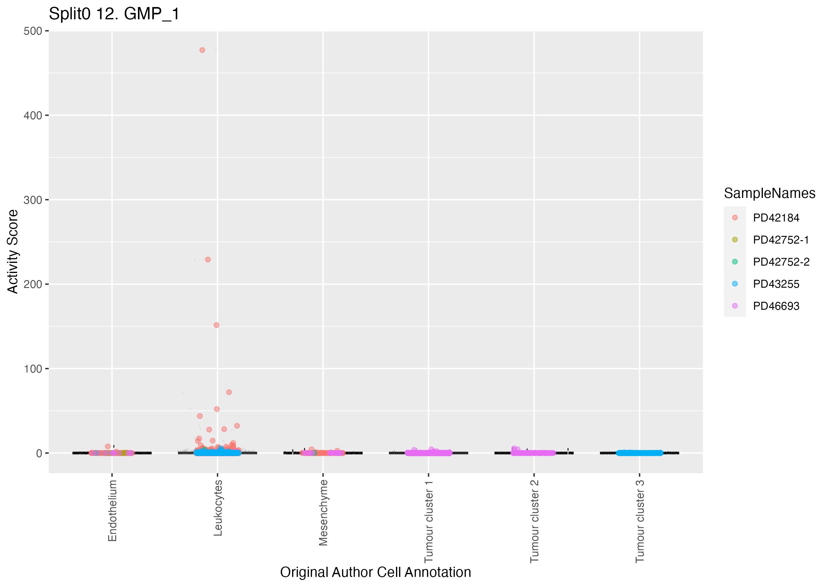 HSC/MPP: Neutrophil-myeloid progenitor (model markers) progenitors of neutrophils and myeloid cells which are transitioned from hematopoietic stem cells and multipotent progenitors: Wilcoxon ranksum test P-value for gene set overrepresentation: 6.20e-01 Mean rank of genes in gene set: 7382 Rank on gene expression program of genes in gene set: