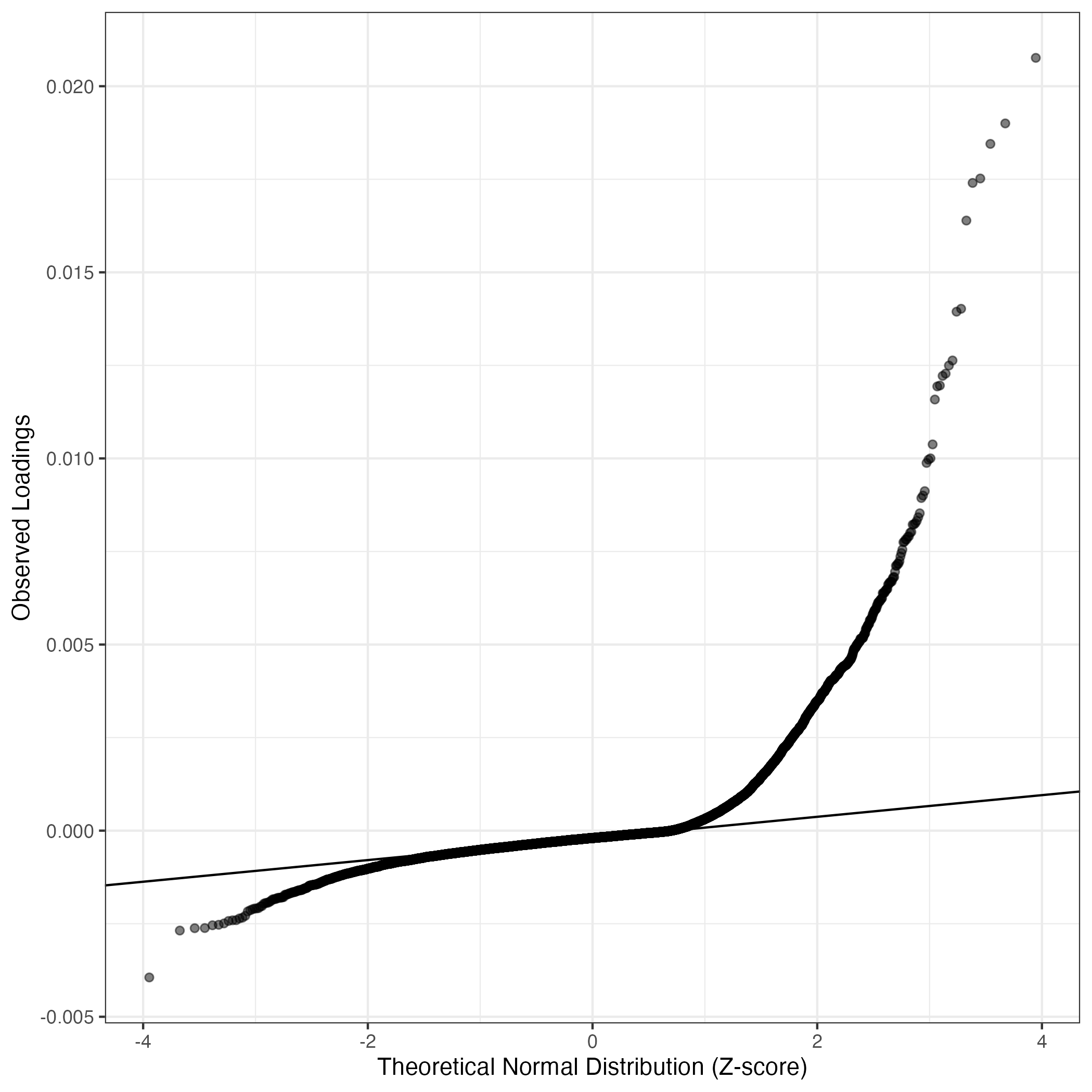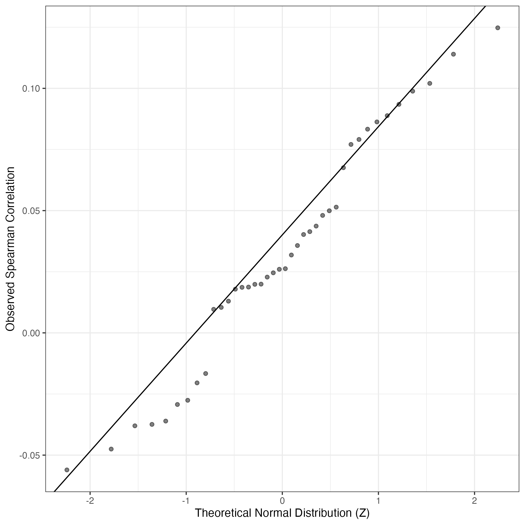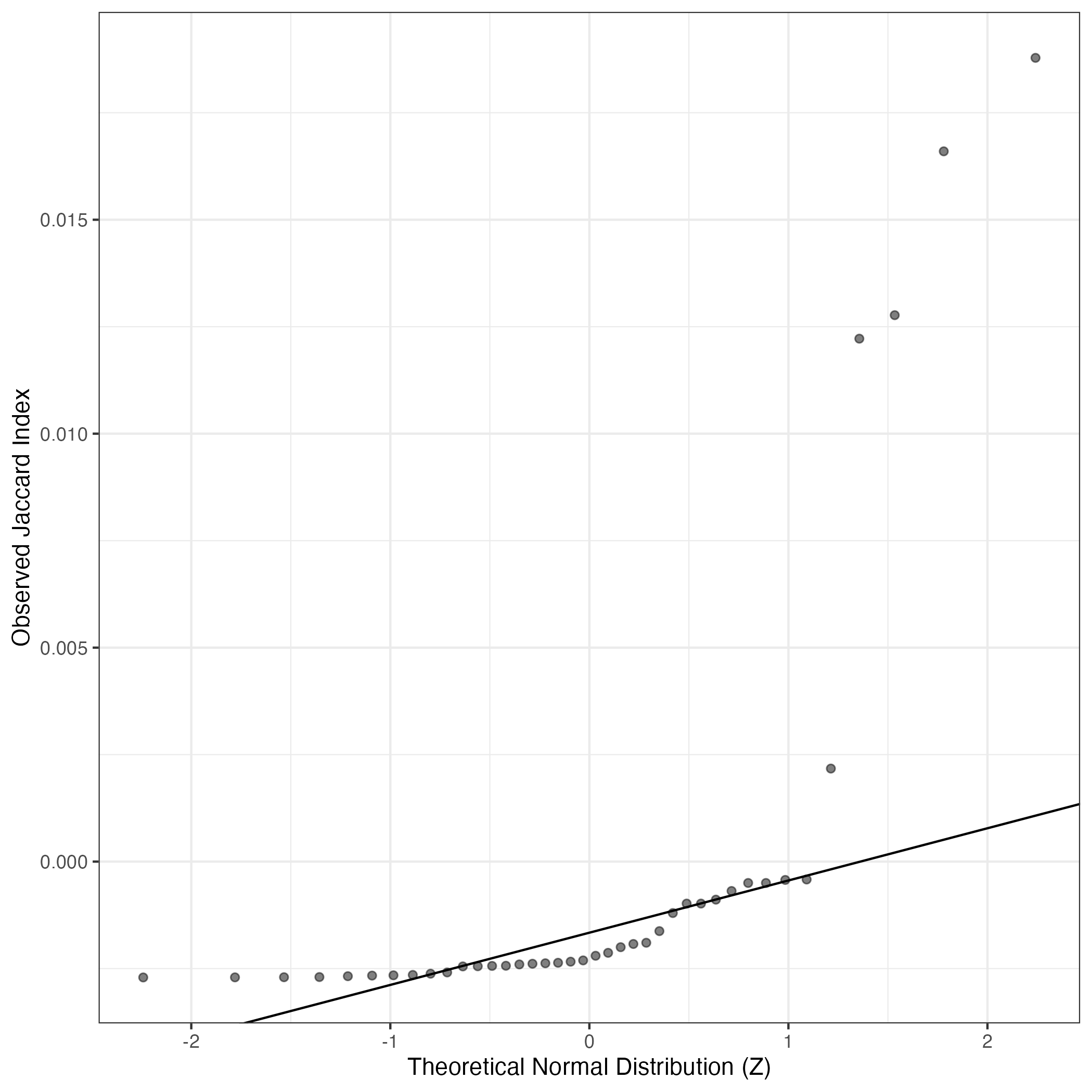 A similar QQ-plot as above, but only for instances where the H value is e.g. > 25, i.e. we are confident that the expression program is active above noise. Agreemenet between these binary vectors is tested using the Jaccard Index, with the P-values calculated by an exact test: