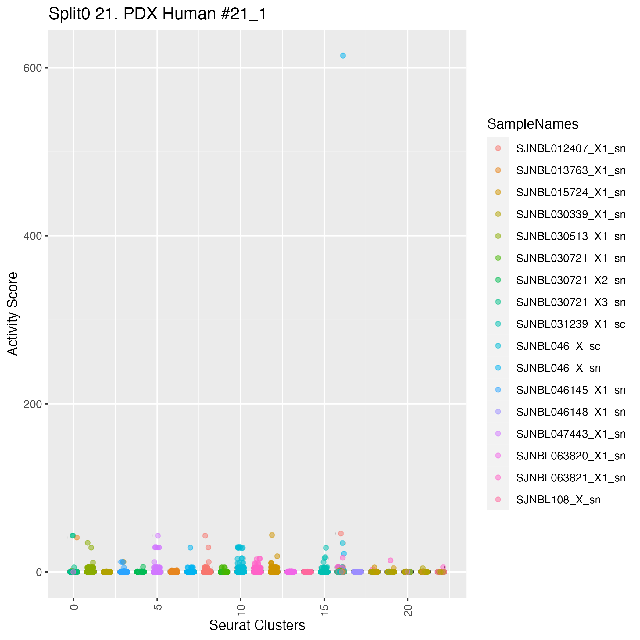UMAP plots showing activity of gene expression program identified in community:21. PDX Human #21