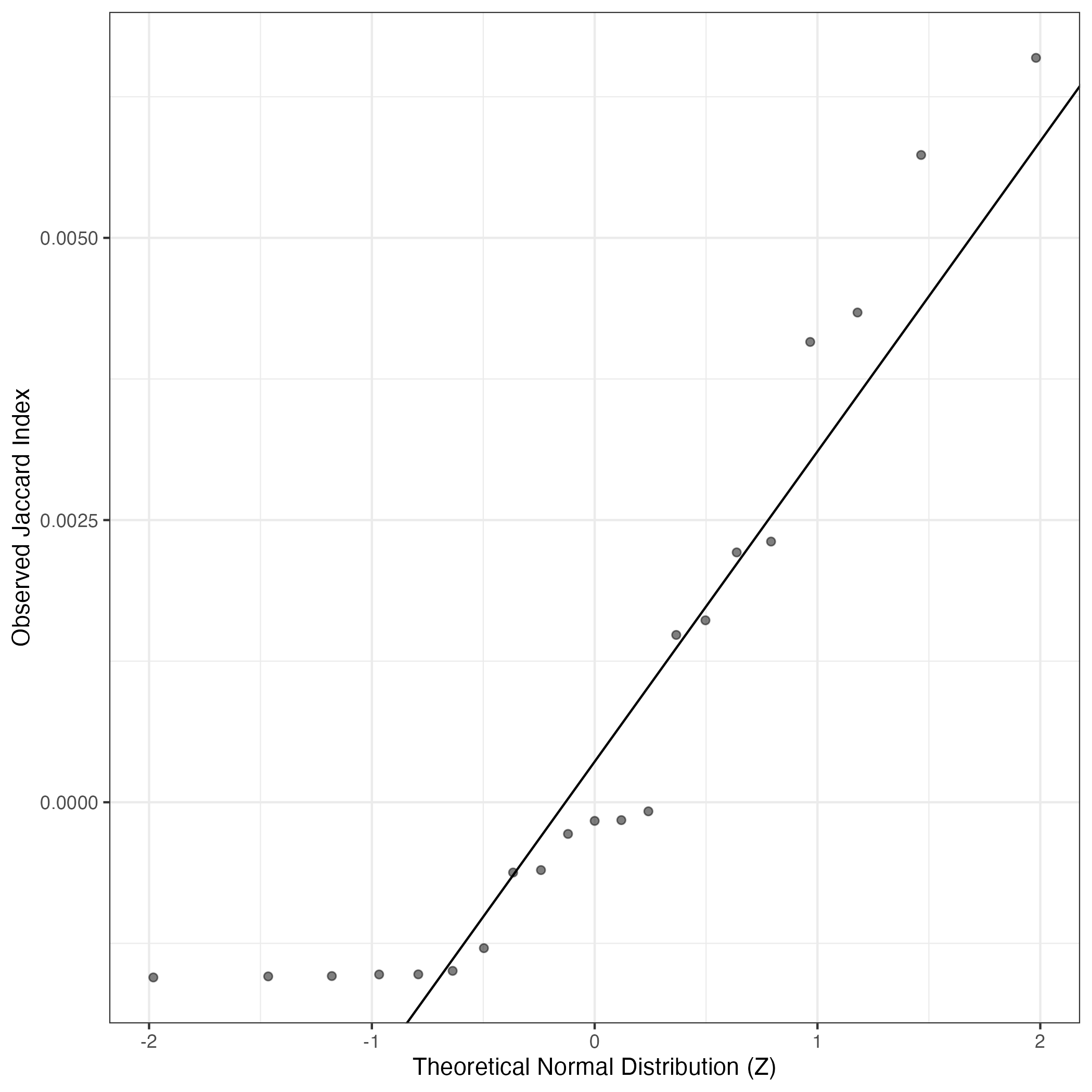 A similar QQ-plot as above, but only for instances where the H value is e.g. > 25, i.e. we are confident that the expression program is active above noise. Agreemenet between these binary vectors is tested using the Jaccard Index, with the P-values calculated by an exact test: