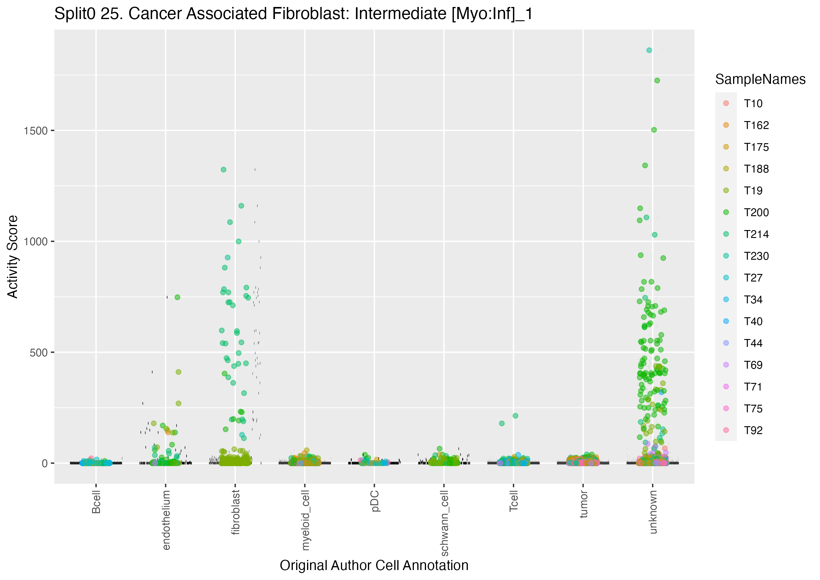 UMAP plots showing activity of gene expression program identified in GEP 25. Cancer Associated Fibroblast: Intermediate [Myo:Inf]: