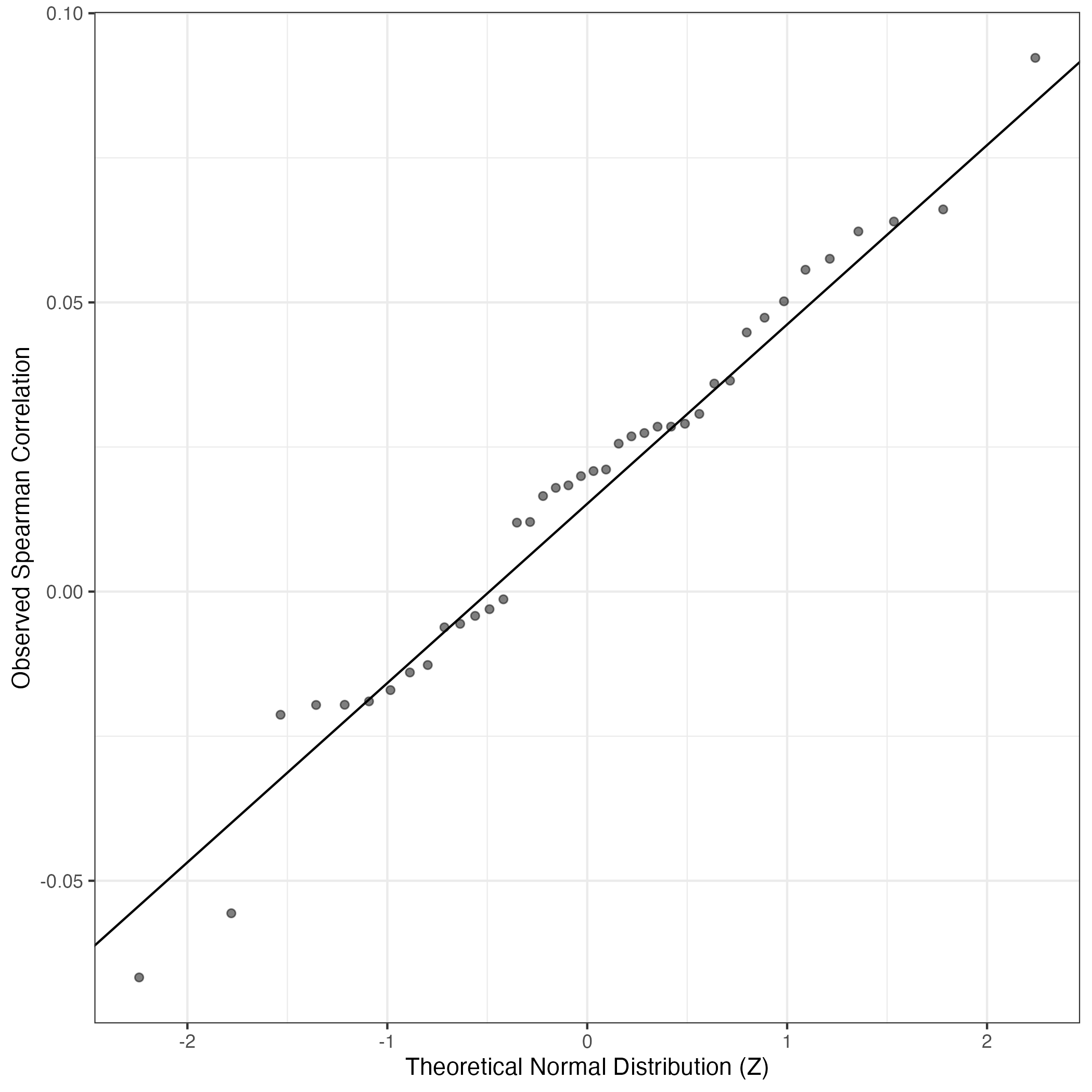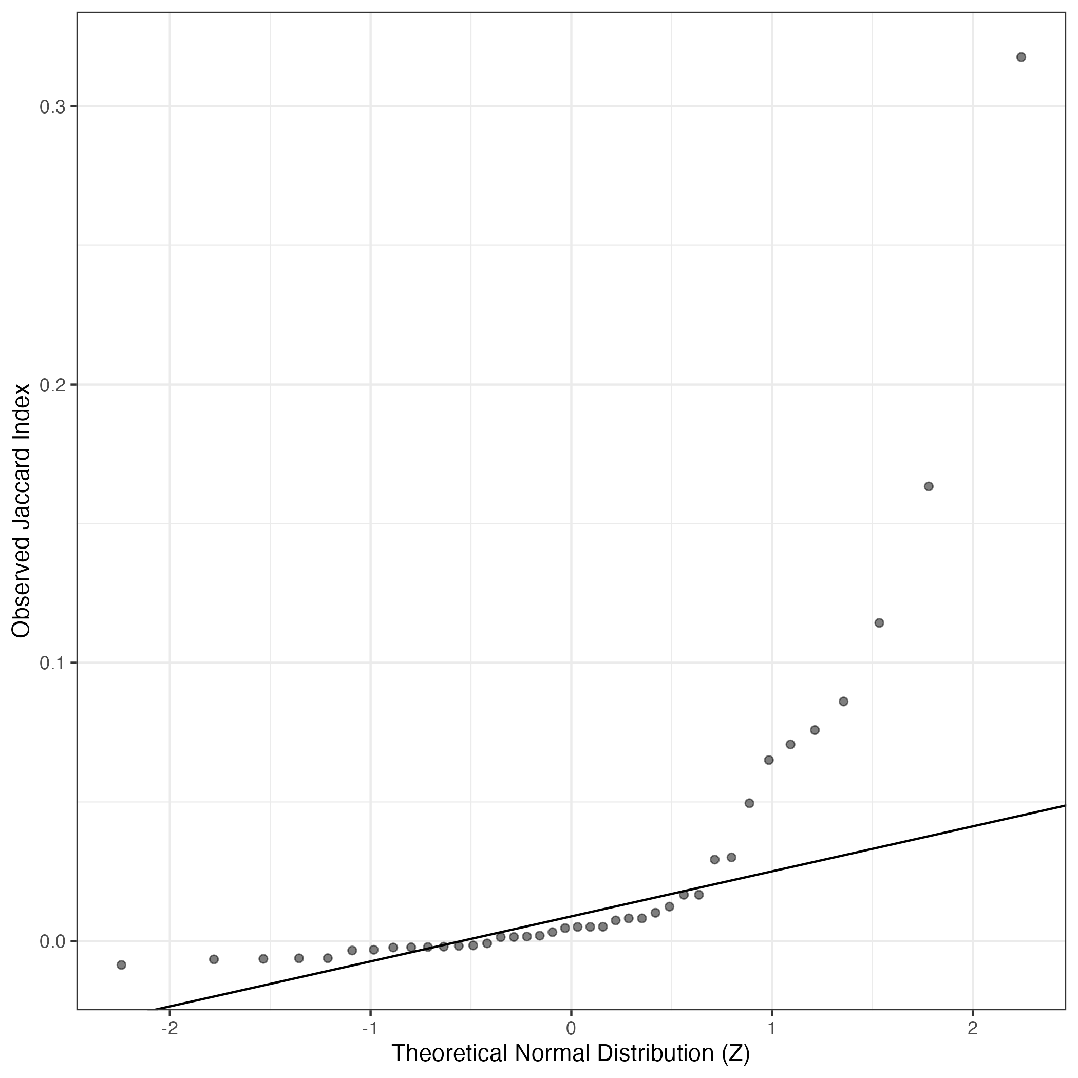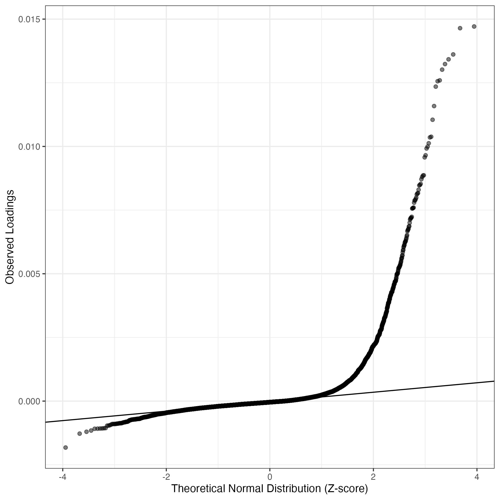 QQ-plot of gene loadings, averaged over both independent splits of the data