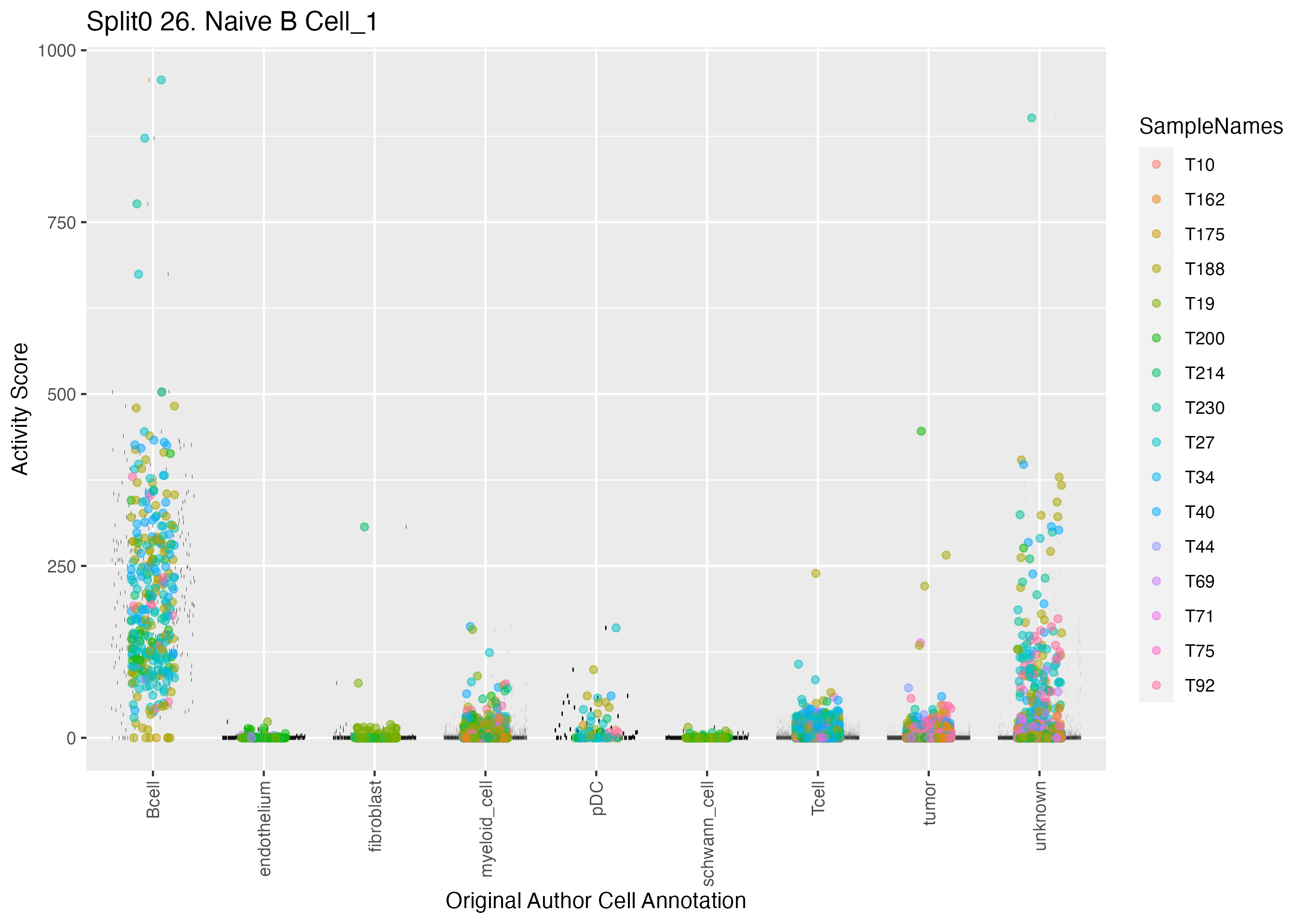 B cells: Transitional B cells (model markers) immature B cell precursors in the bone marrow which connect Pre-B cells with mature naive B cells and are subject to the process of B cell selection: Wilcoxon ranksum test P-value for gene set overrepresentation: 9.57e-01 Mean rank of genes in gene set: 12485 Rank on gene expression program of genes in gene set: