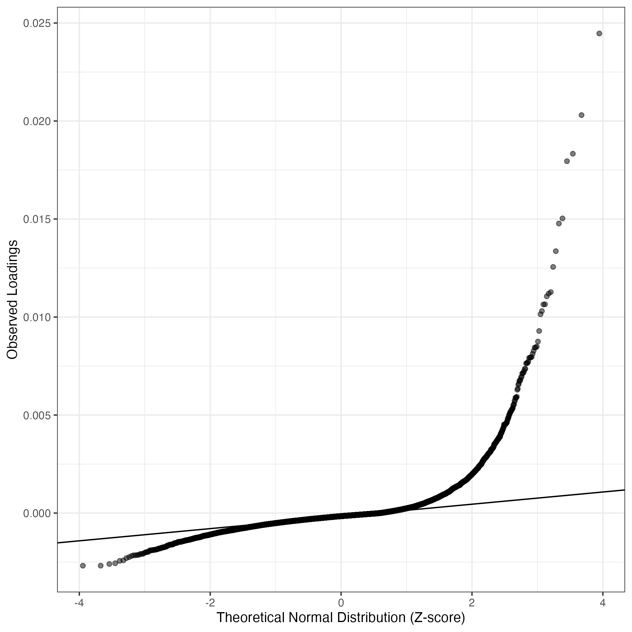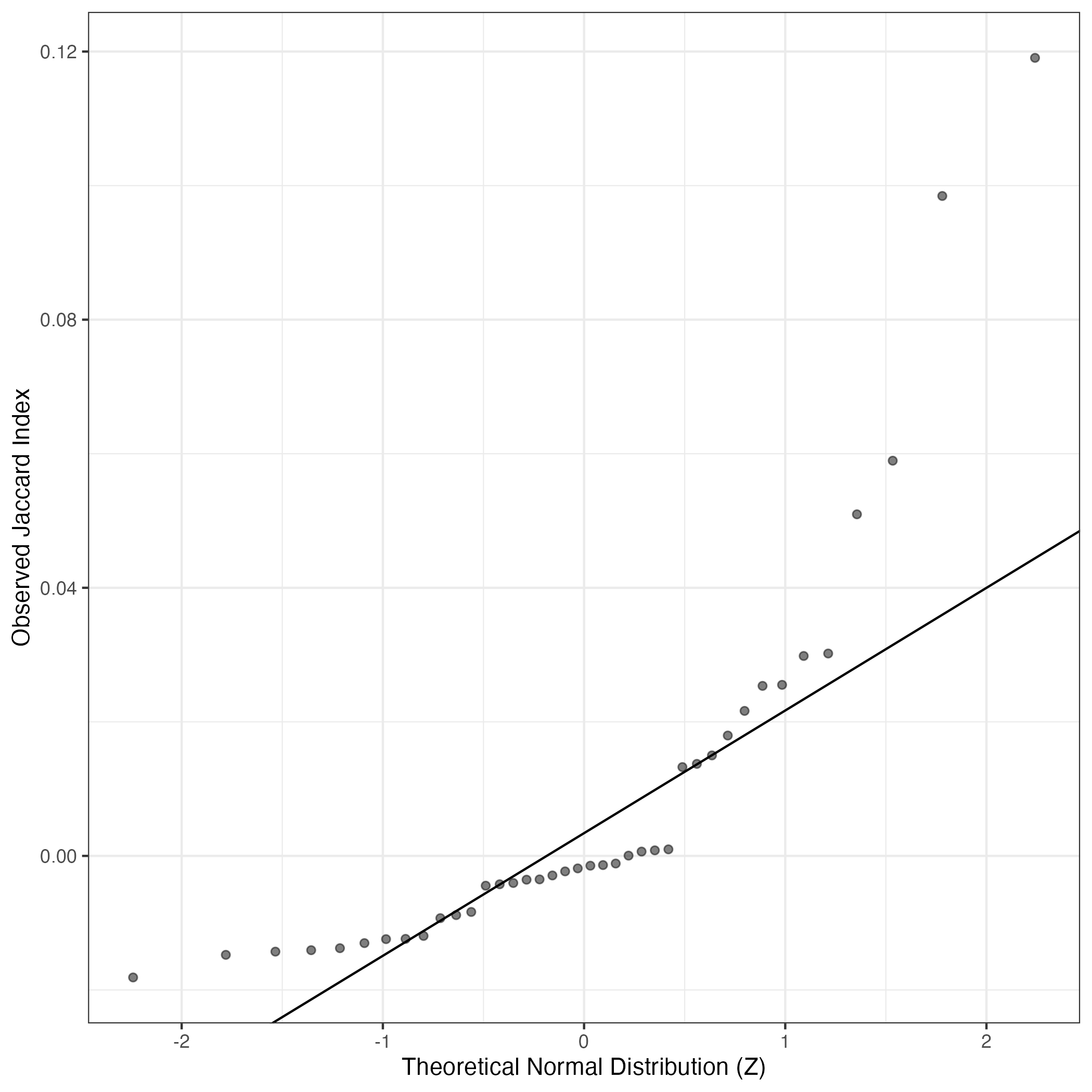 A similar QQ-plot as above, but only for instances where the H value is e.g. > 25, i.e. we are confident that the expression program is active above noise. Agreemenet between these binary vectors is tested using the Jaccard Index, with the P-values calculated by an exact test:
