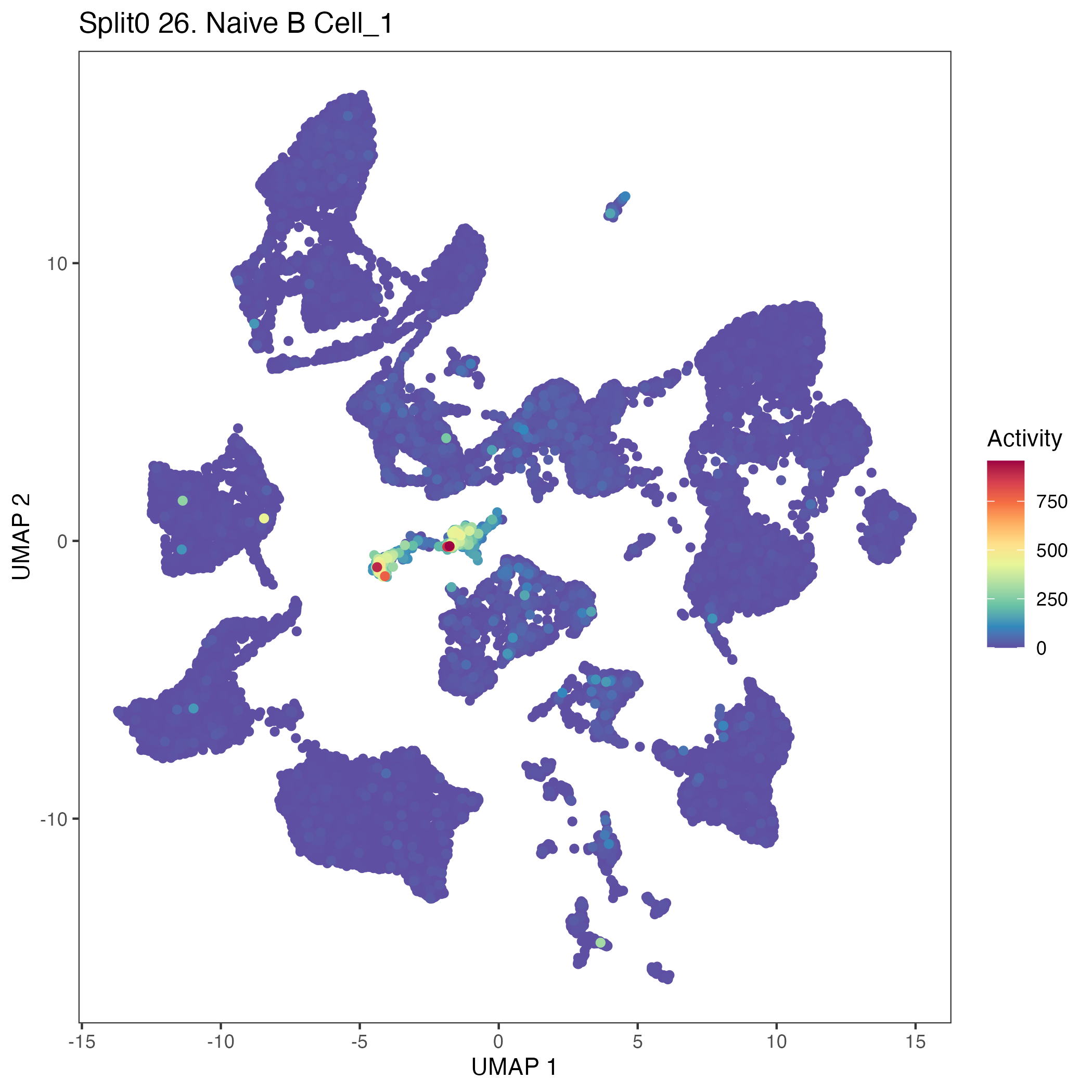 Cycling cells: Cycling B cells (curated markers) proliferating B lymphocytes: Wilcoxon ranksum test P-value for gene set overrepresentation: 6.15e-01 Mean rank of genes in gene set: 6889 Rank on gene expression program of genes in gene set: