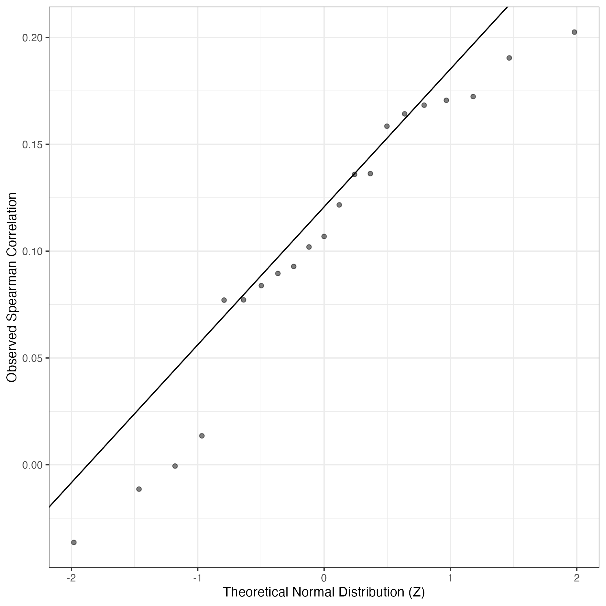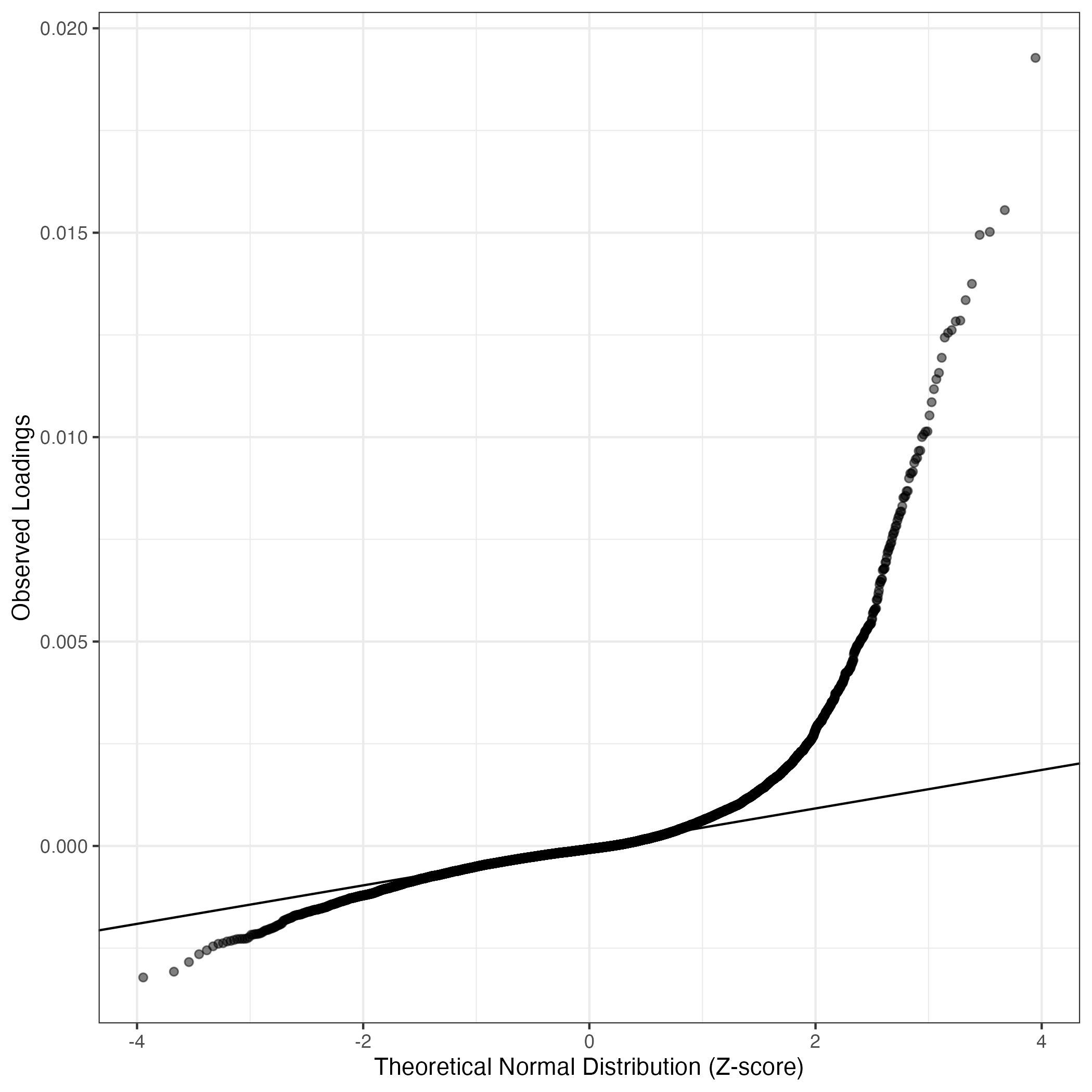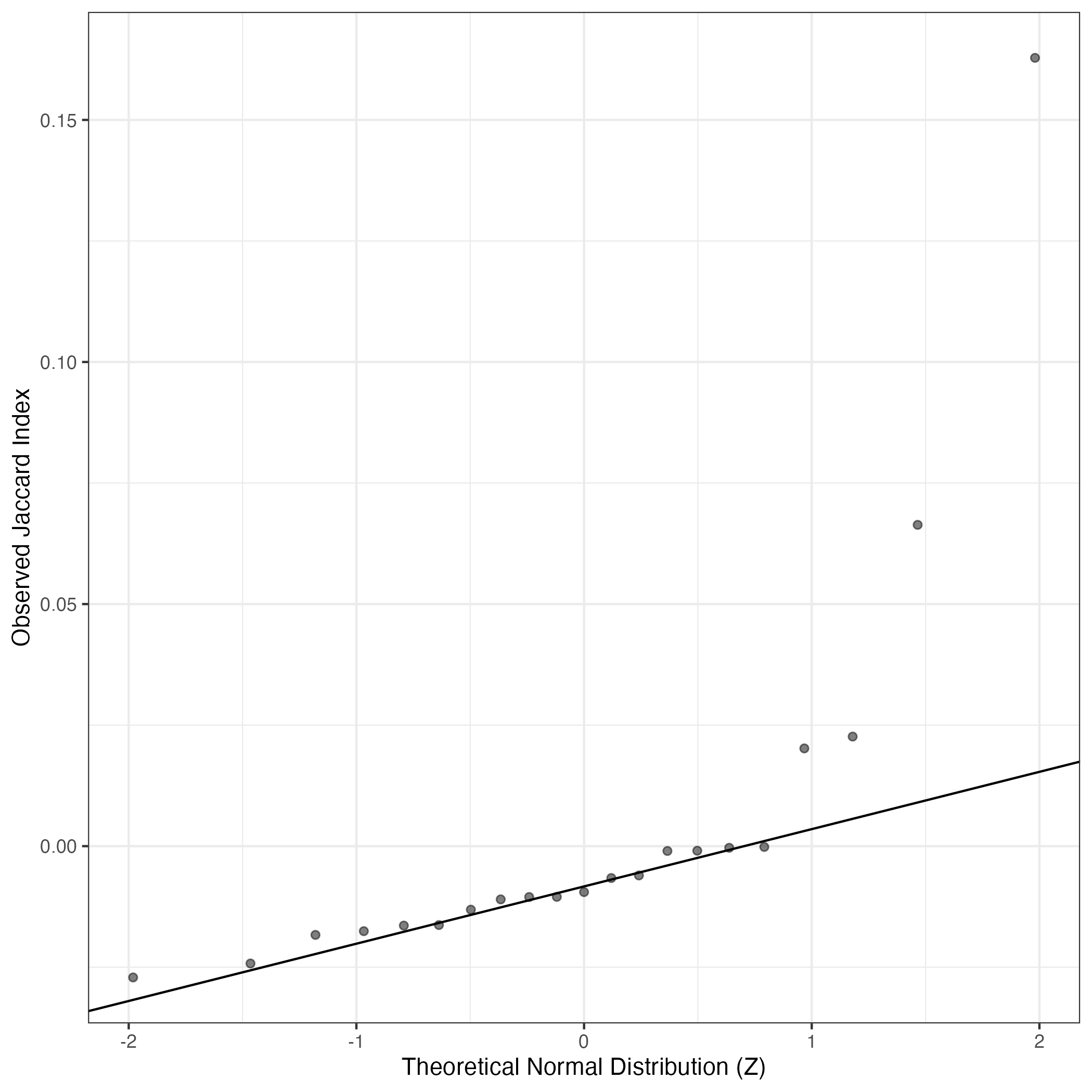 A similar QQ-plot as above, but only for instances where the H value is e.g. > 25, i.e. we are confident that the expression program is active above noise. Agreemenet between these binary vectors is tested using the Jaccard Index, with the P-values calculated by an exact test: