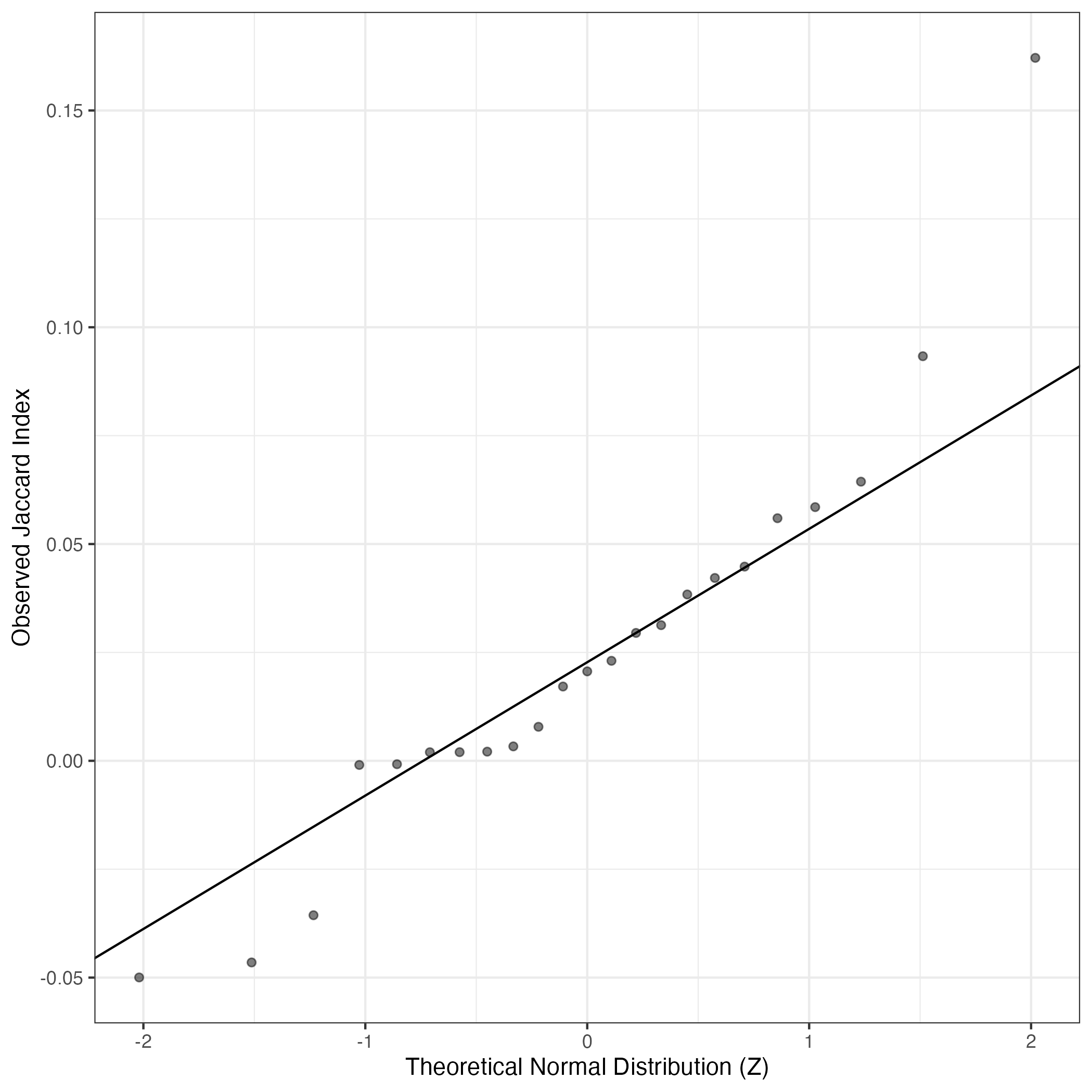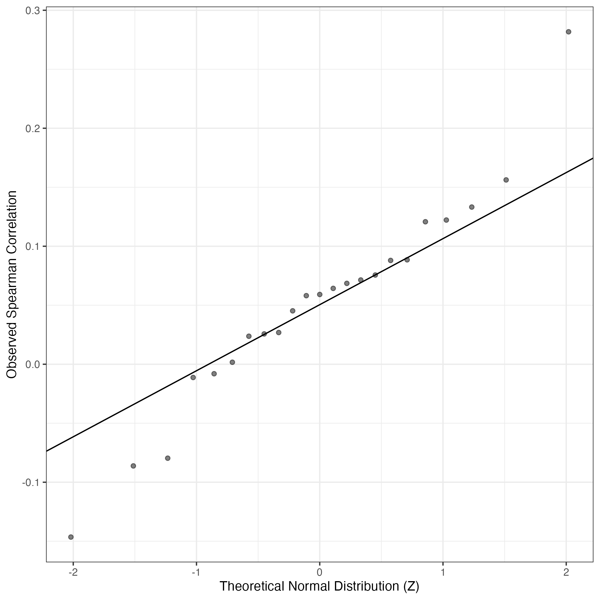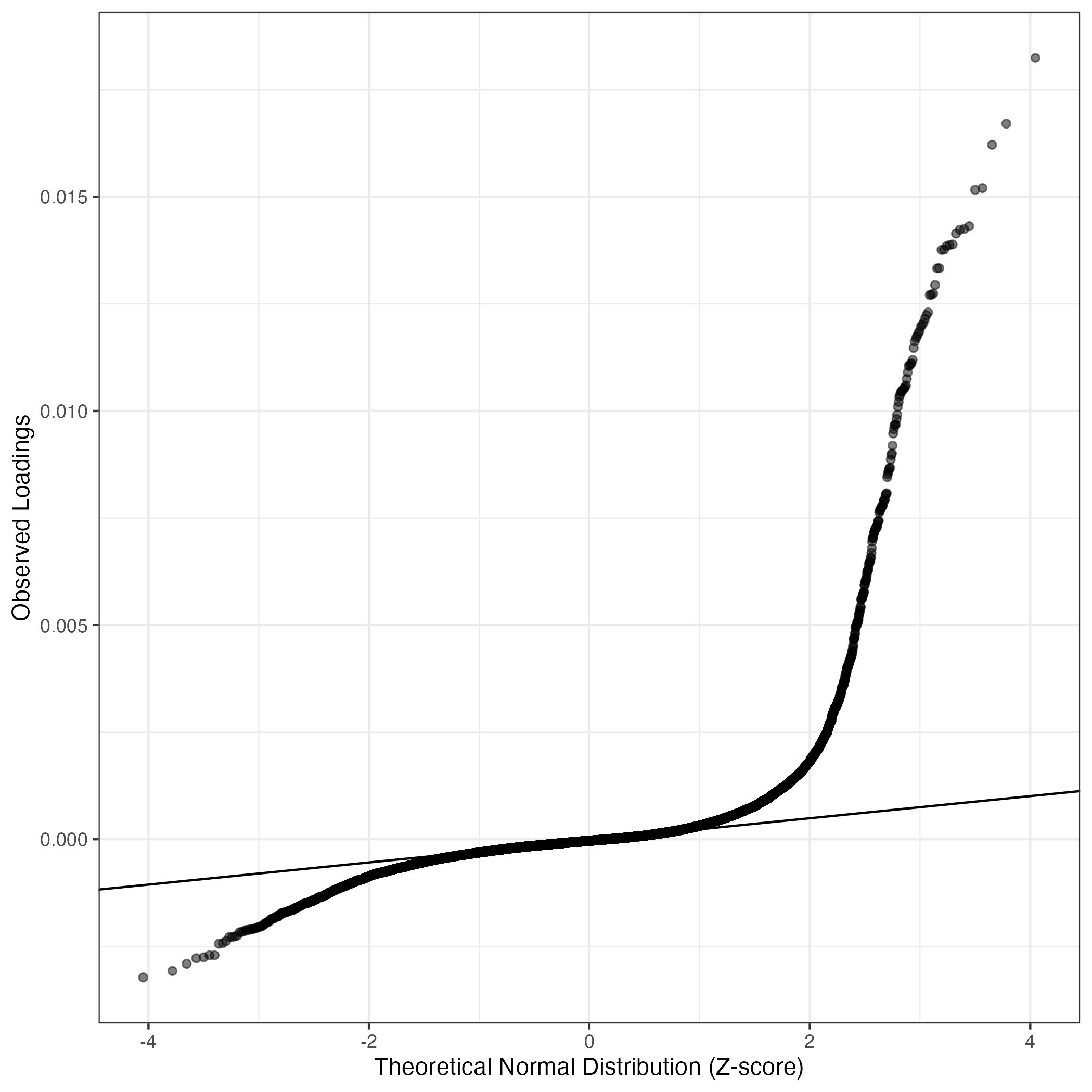 QQ-plot of gene loadings, averaged over both independent splits of the data