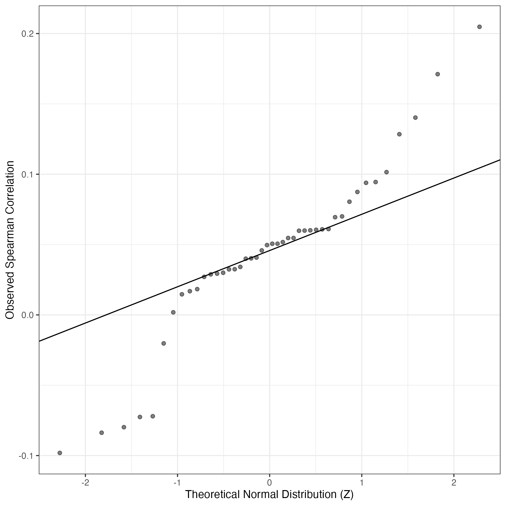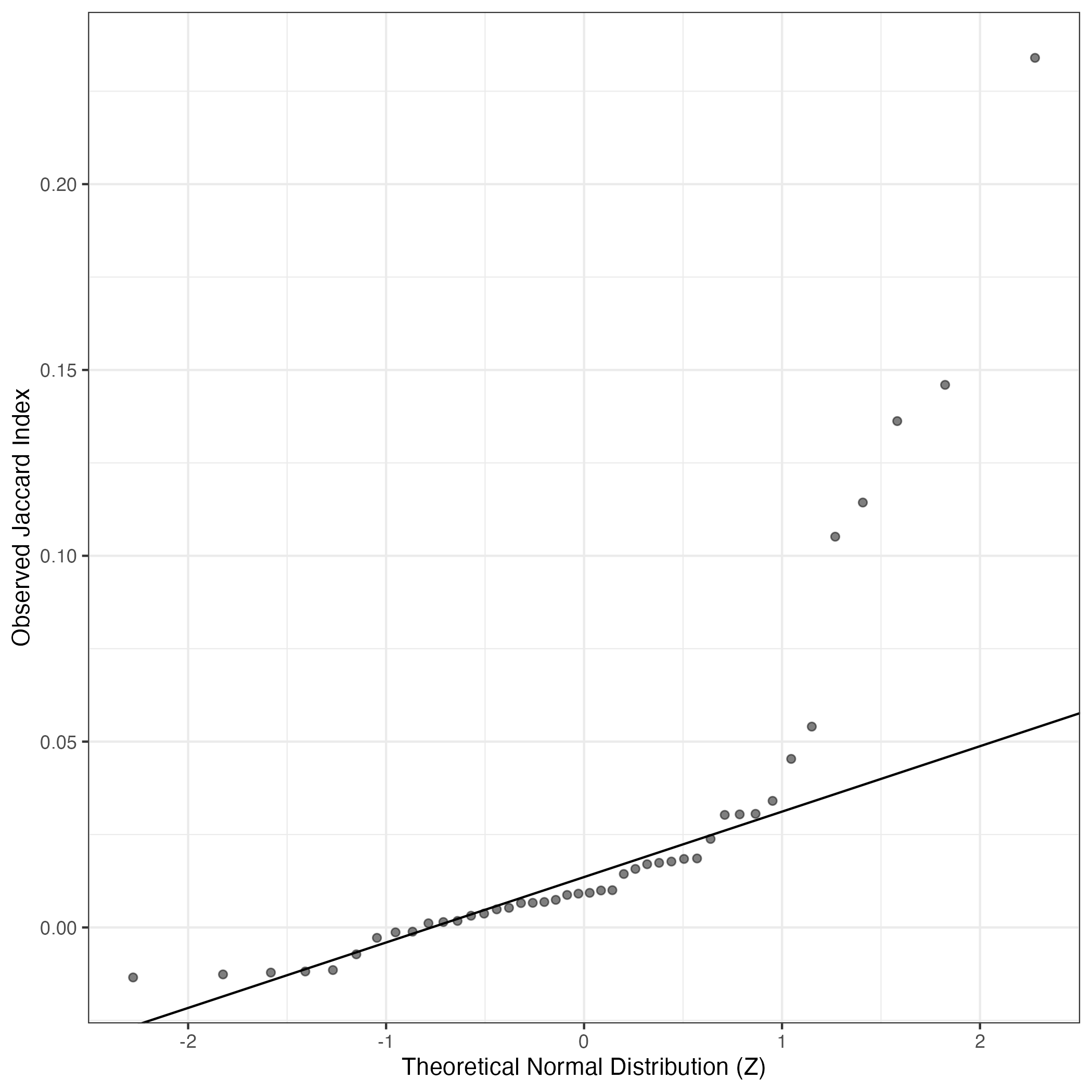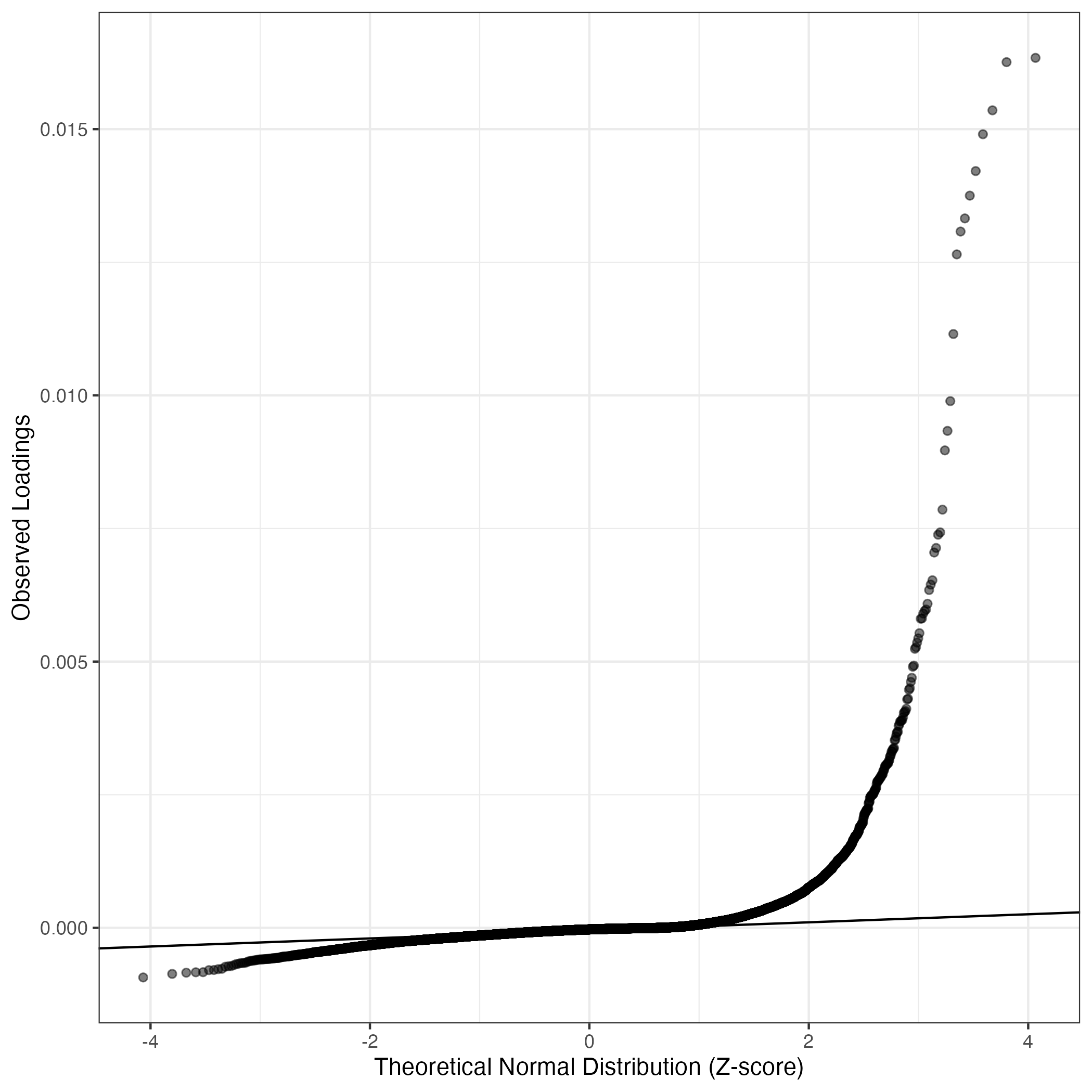 QQ-plot of gene loadings, averaged over both independent splits of the data