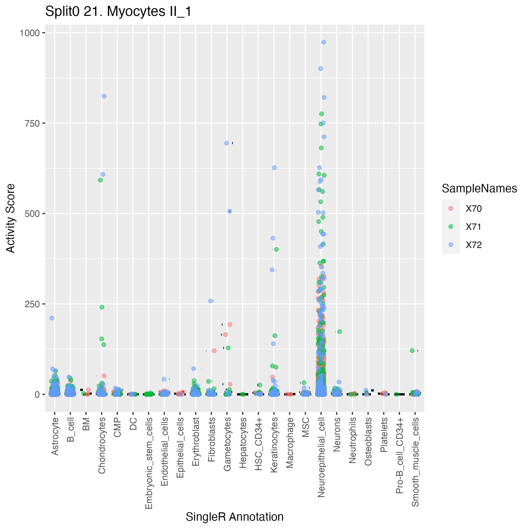 Cycling cells: Cycling T cells (model markers) proliferating T lymphocytes: Wilcoxon ranksum test P-value for gene set overrepresentation: 9.30e-01 Mean rank of genes in gene set: 14410.67 Rank on gene expression program of genes in gene set: