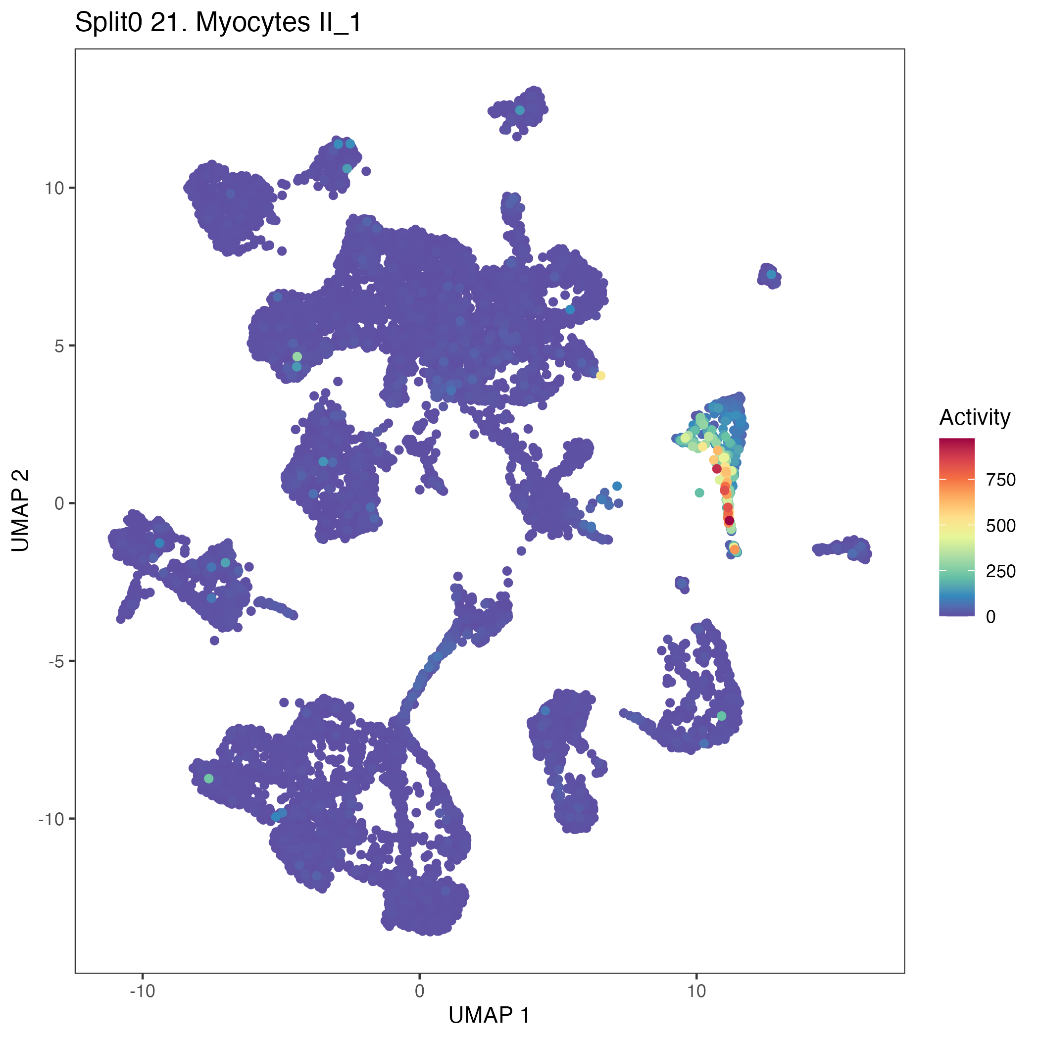 Myocytes (Jansky) Mentioned in the main text (Jansky et al, Nature Genetics (2021)), page 1, that MYH3+ Myocytes were identified in their fetal adrenal glands, this is also highlighted in the UMAP plot on their Fig 1B. Additional genes also shown in their Extended data Figure 2D.: Wilcoxon ranksum test P-value for gene set overrepresentation: 2.20e-03 Mean rank of genes in gene set: 492.33 Rank on gene expression program of genes in gene set: