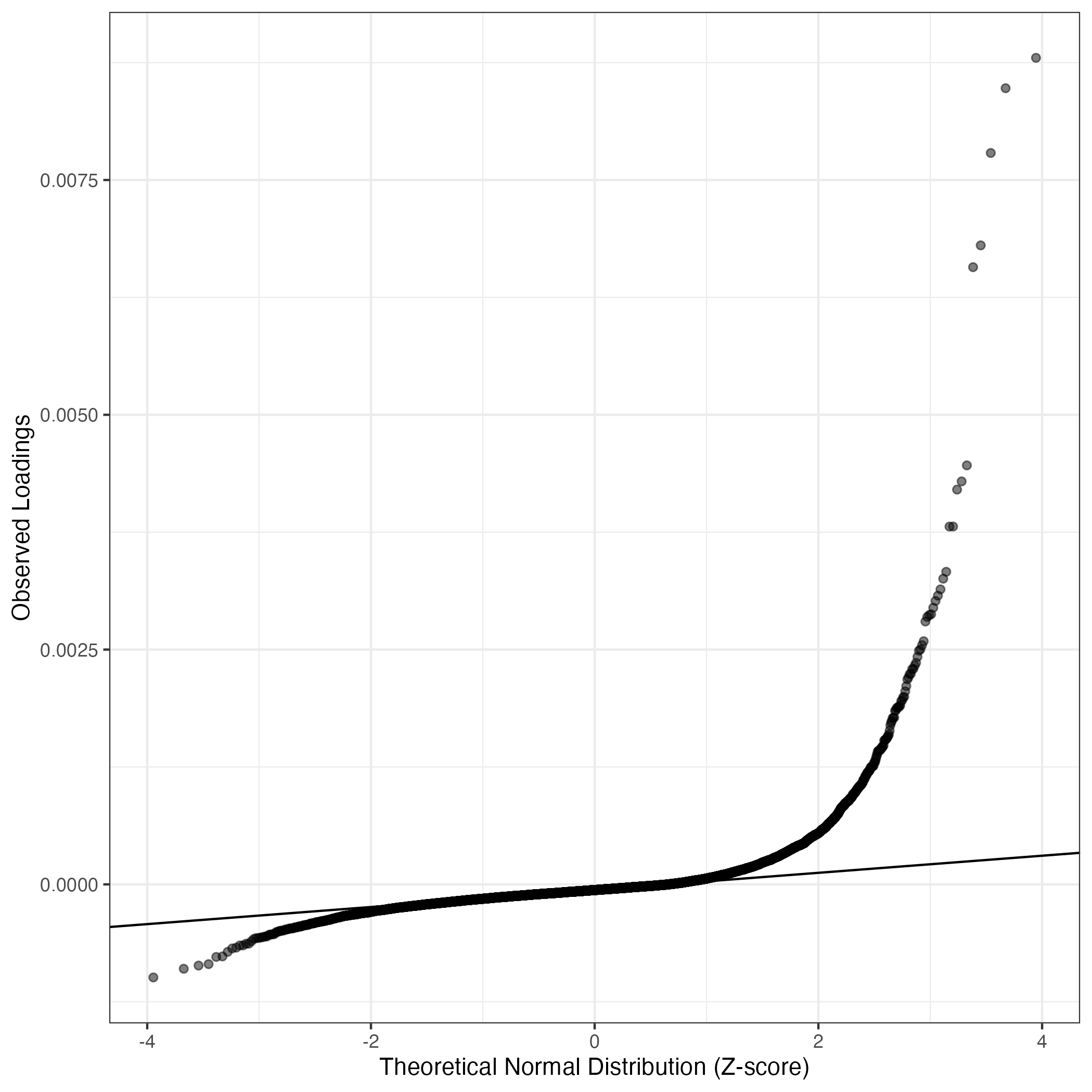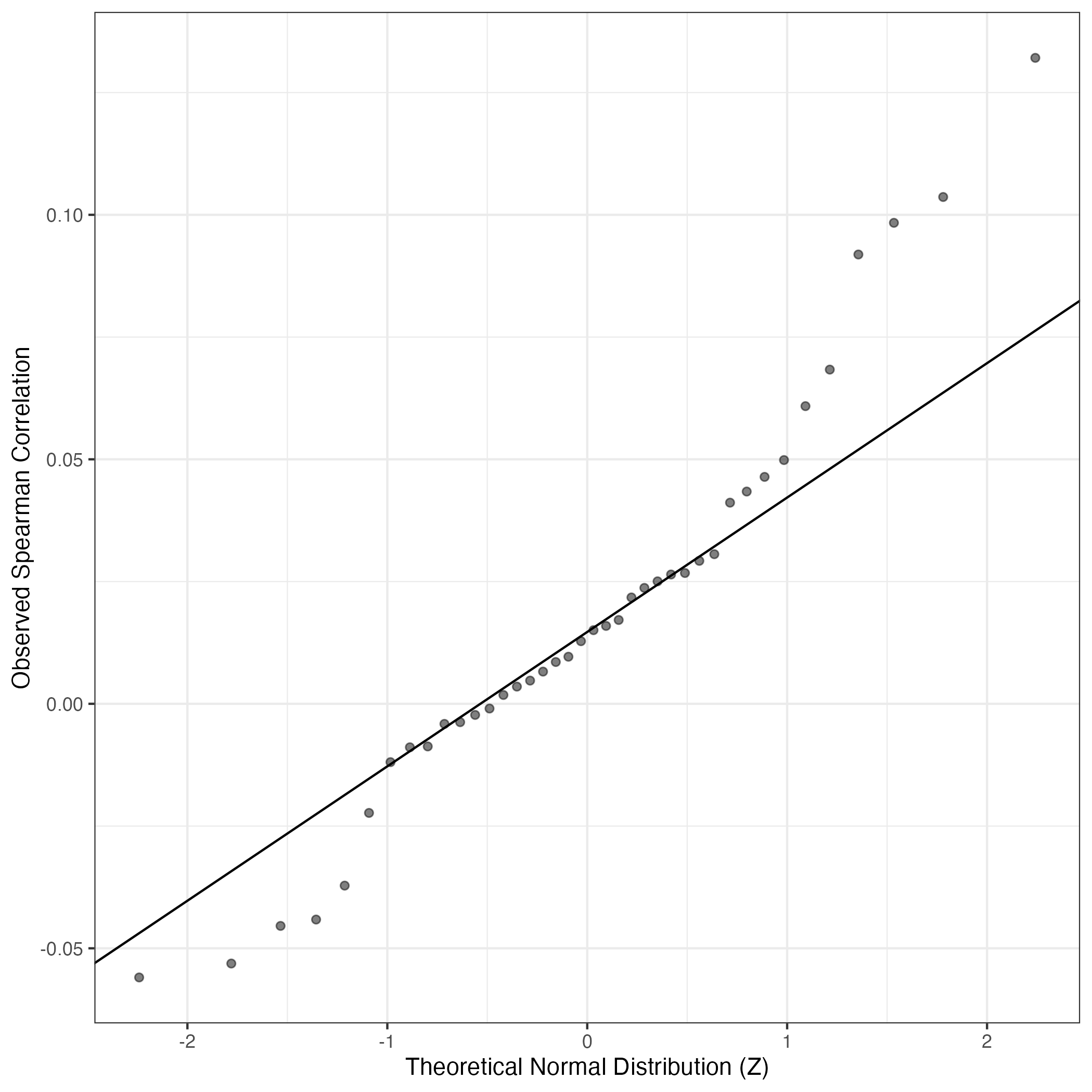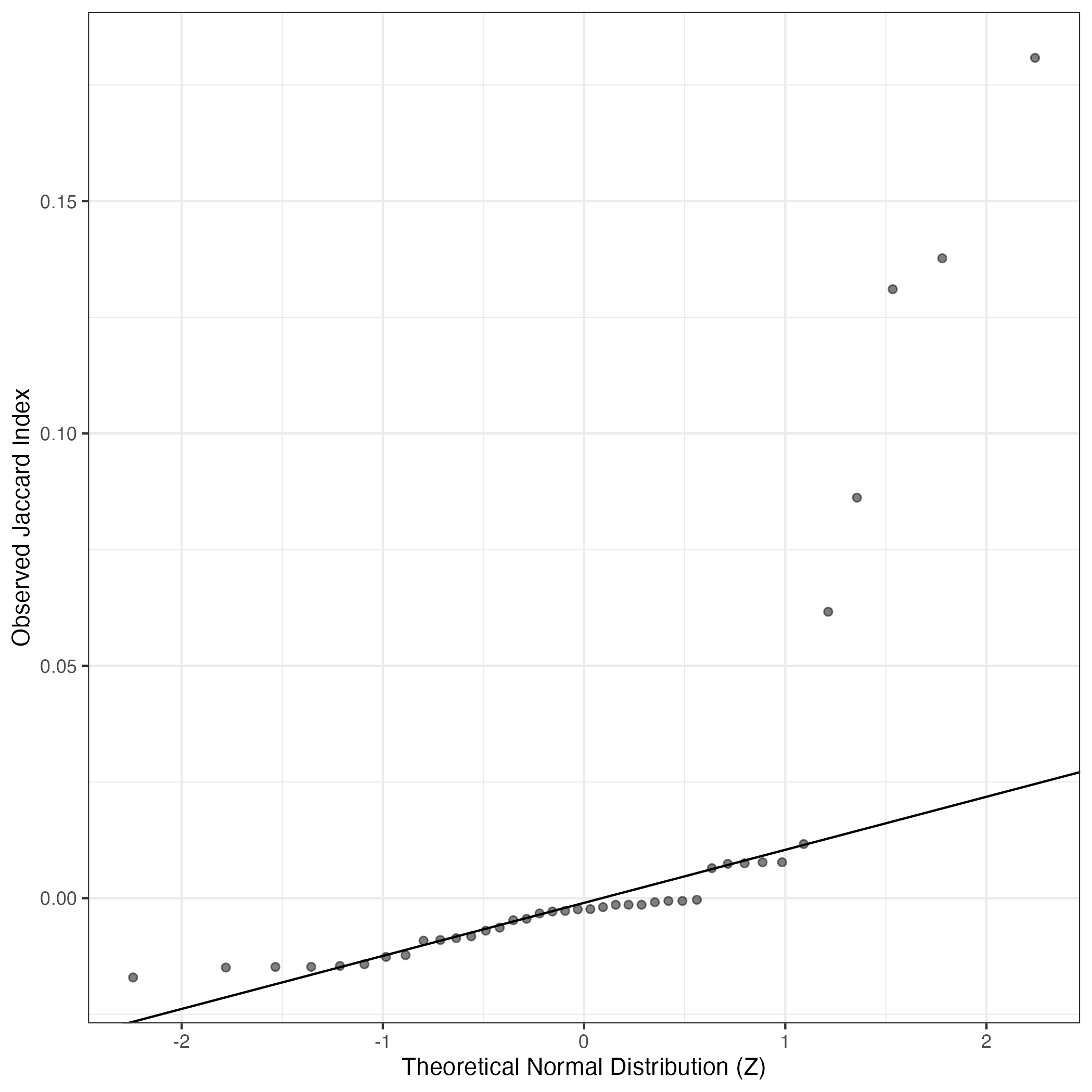 A similar QQ-plot as above, but only for instances where the H value is e.g. > 25, i.e. we are confident that the expression program is active above noise. Agreemenet between these binary vectors is tested using the Jaccard Index, with the P-values calculated by an exact test: