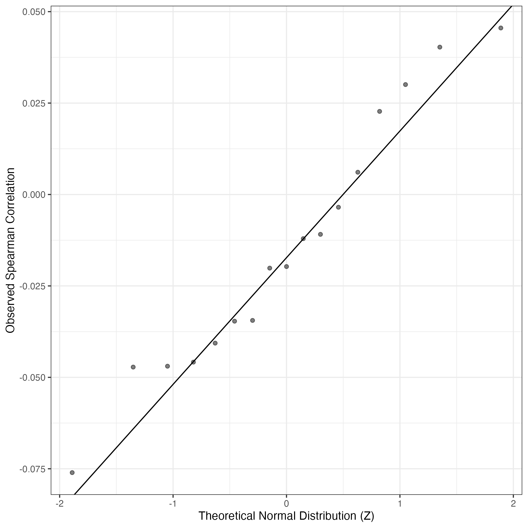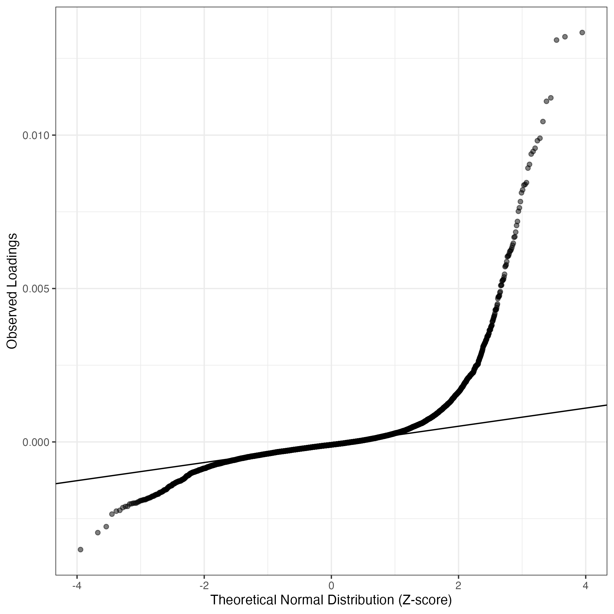 QQ-plot of gene loadings, averaged over both independent splits of the data